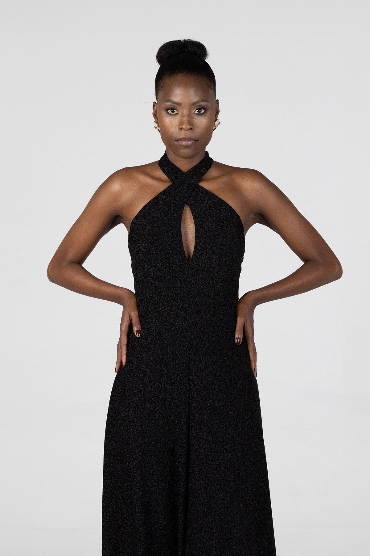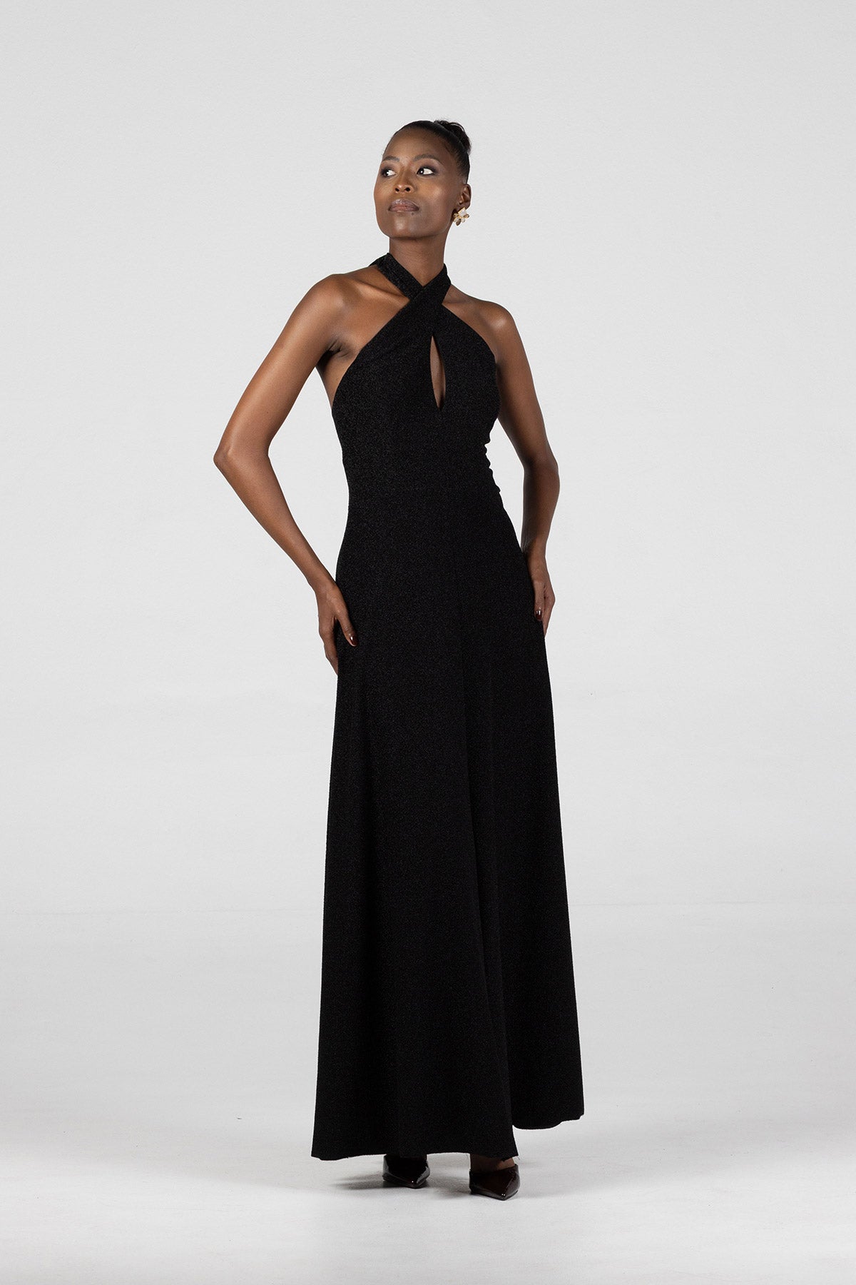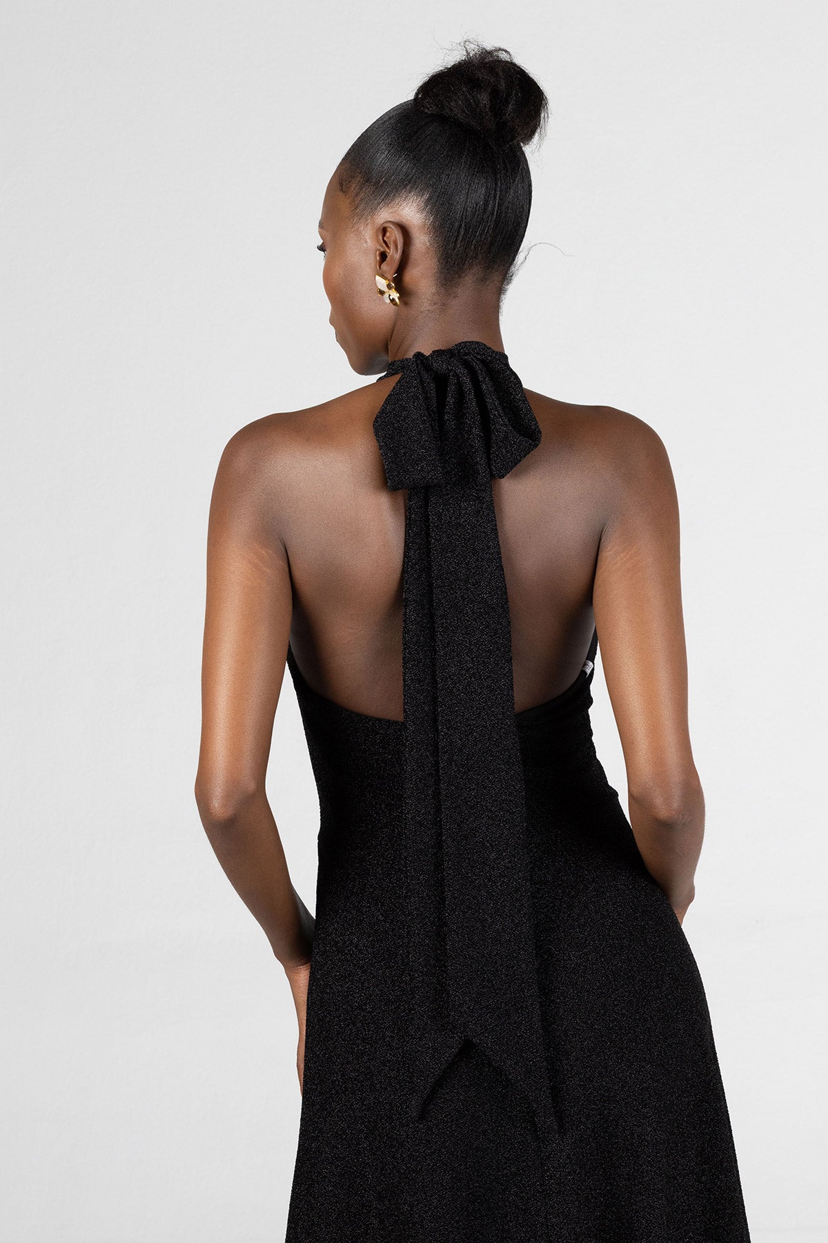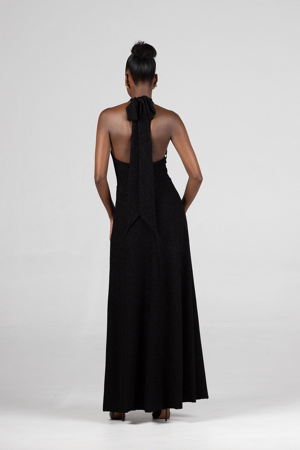 This crossover tie dress in luxe, four-way stretch Lurex offers a radiant blend of elegance and allure. The fitted waist accentuates your shape, while the maxi length drapes beautifully for a sleek, elongated silhouette. With versatile, extra-long ties, this dress allows you to personalize your look: style the ties in a large, dramatic bow at the back, or wrap them around the waist with a crossover effect that flows gracefully down your back.Designed to shimmer with every movement, this dress is ideal for any occasion where you want to exude confidence and sophistication.