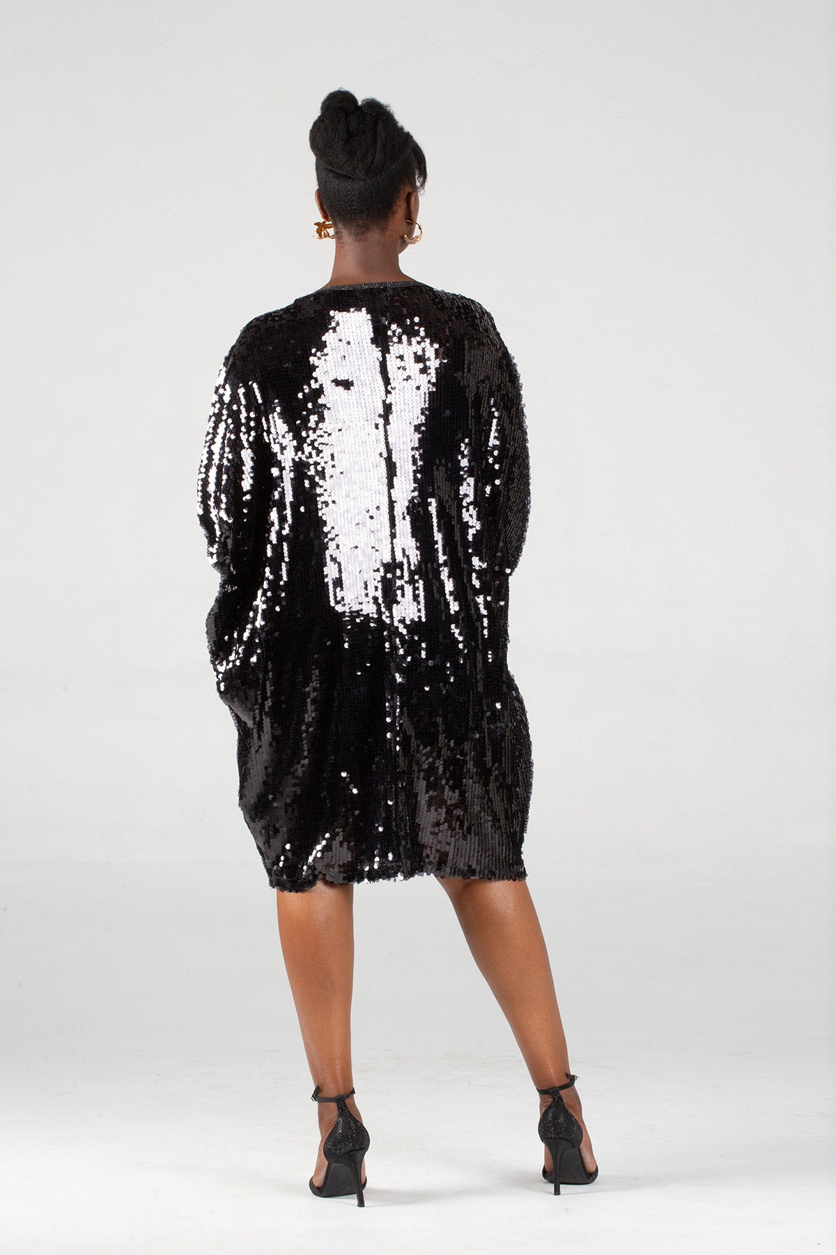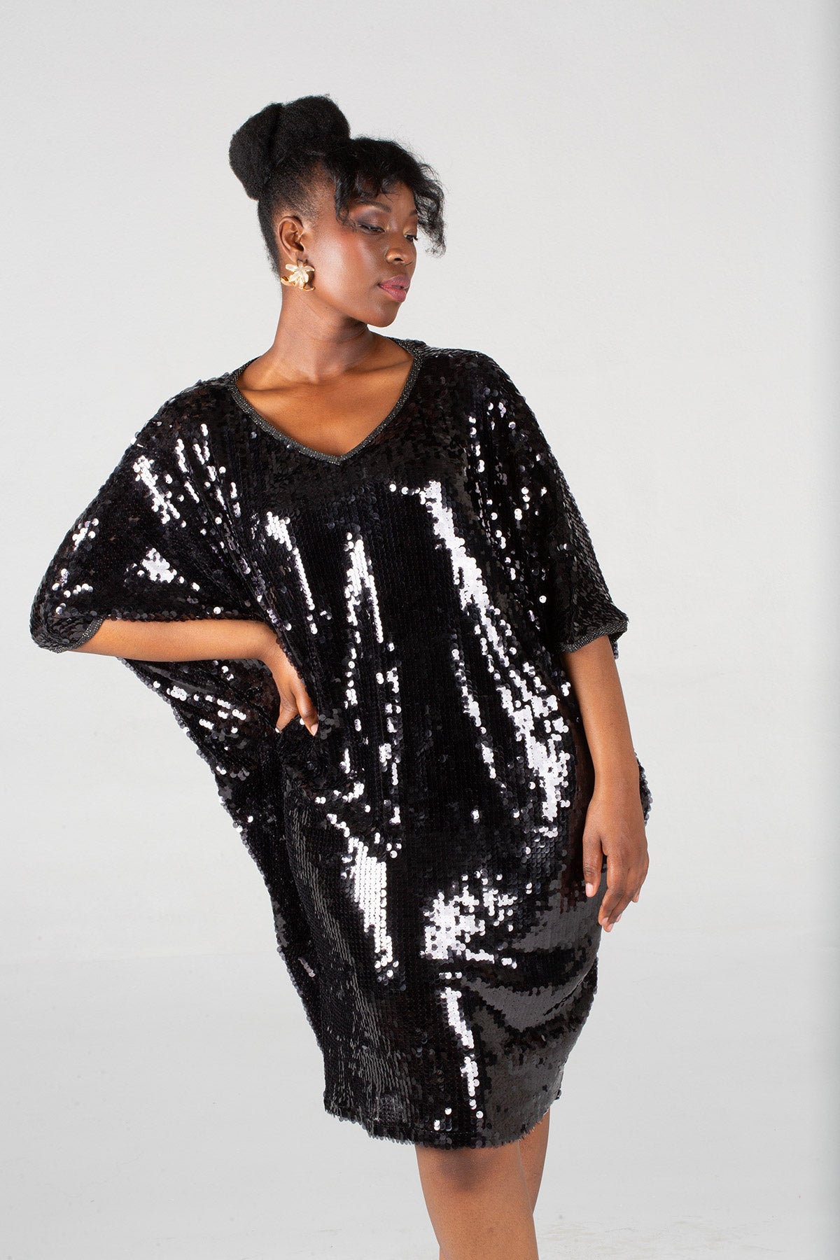The most elevated and elegant version of the Sequin trapeze dress - this dress features glamorous sequins and is pure elegance! It sparkles as you move! It is a one-size-fits-all for sizes 32 (S) to 46 (5XL), has a flattering V-neck design, and can easily be styled for the variable weather we often experience.