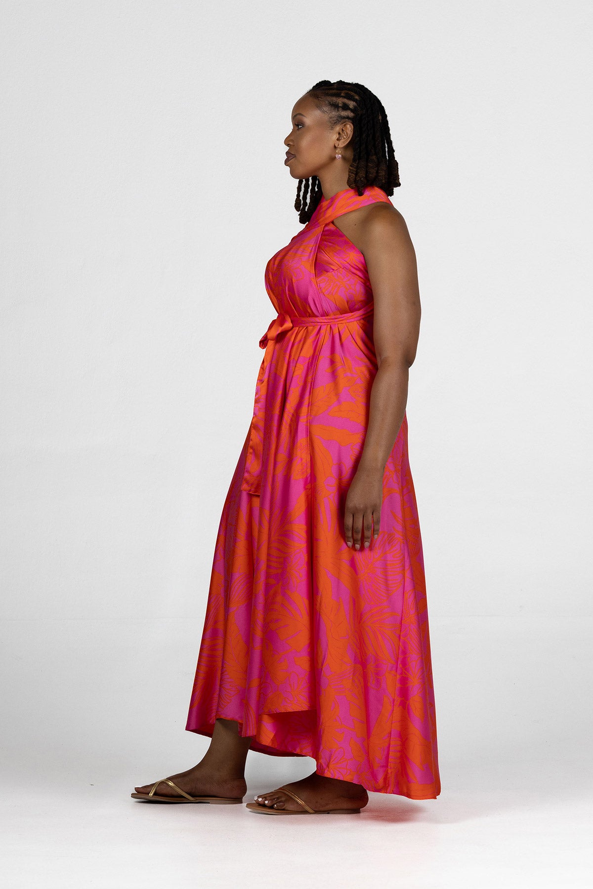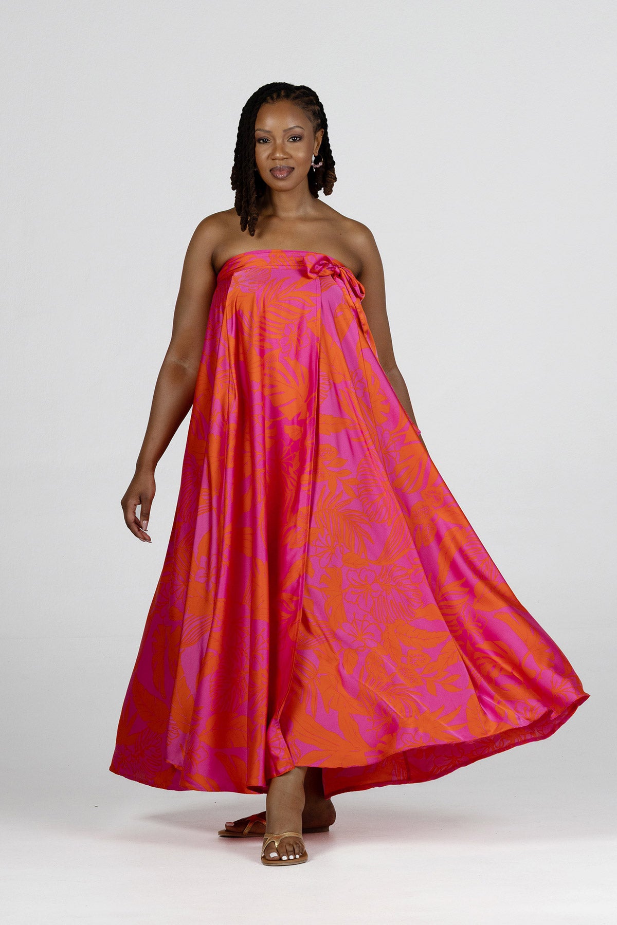 The Multi-Way Wrap Dress in Coral Pink is all about versatility. Designed with an A-line maxi shape, it can be styled as a classic flowing dress, a one-shoulder look, a strapless silhouette, or even as a chic skirt. The lightweight fabric drapes beautifully and makes it perfect for warm days, events, or easy holiday dressing.