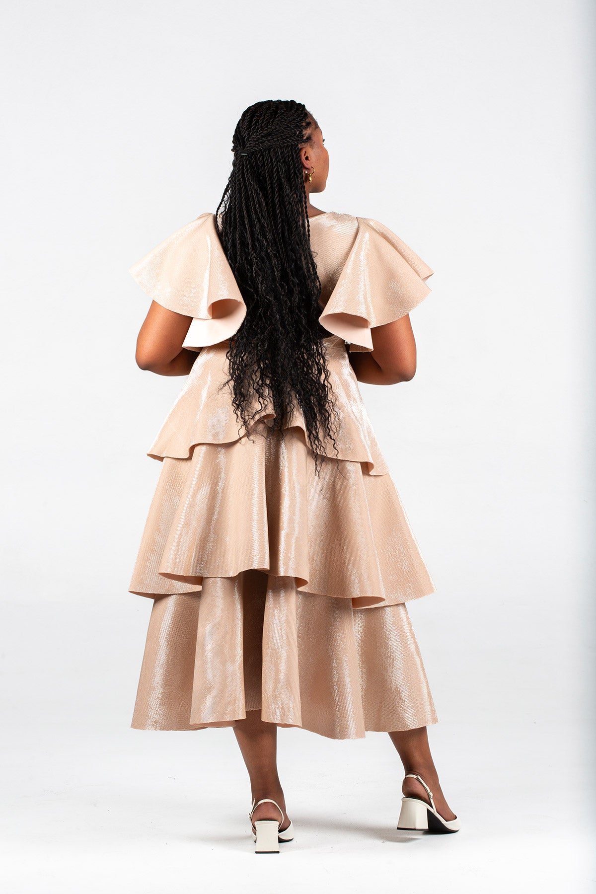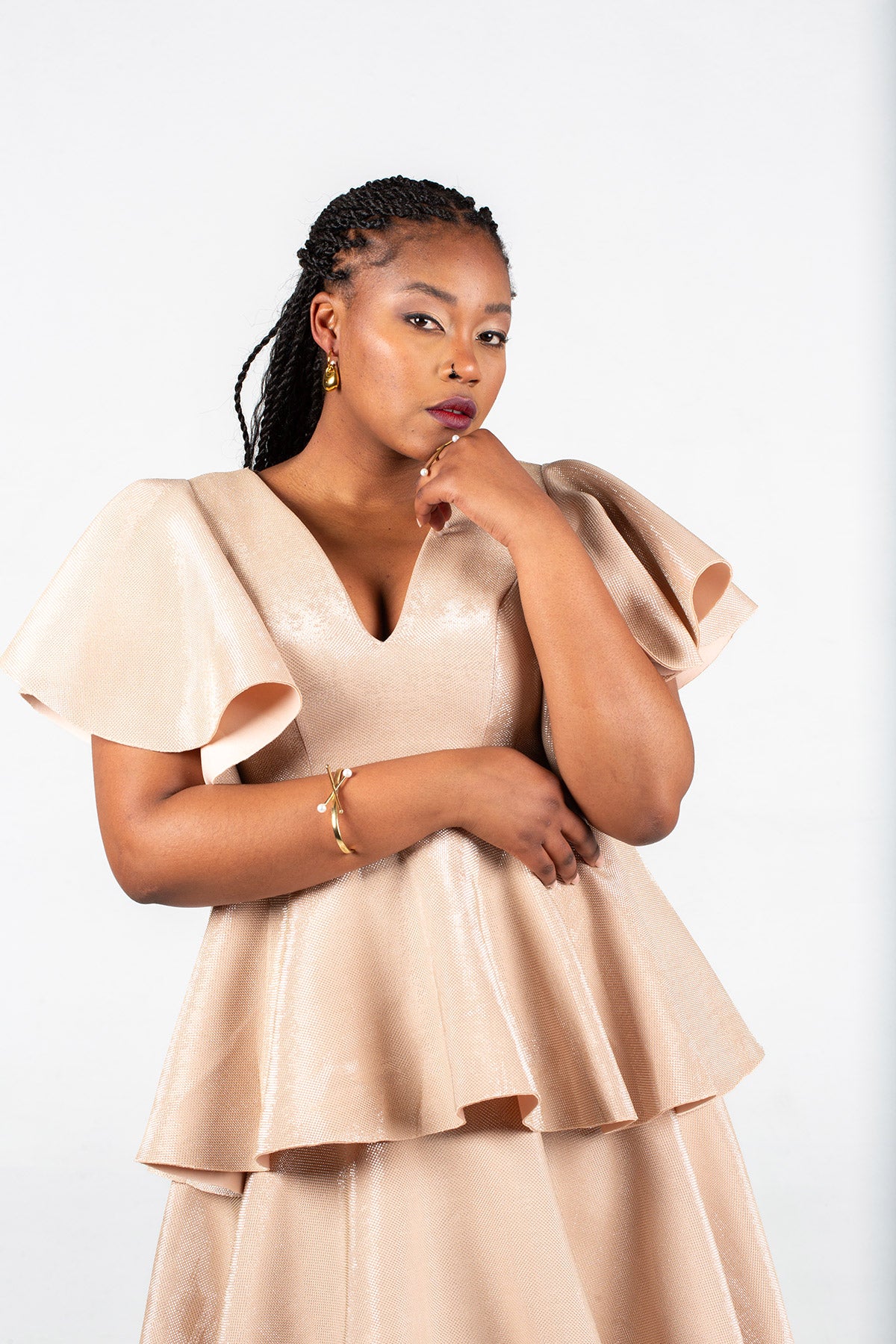 Make a statement with this fit & flare dress. The circular skirt & sleeve panels create dramatic volume while the nipped in waist & plunging neckline flatter the figure. A touch of shimmer makes this the perfect for the party season.