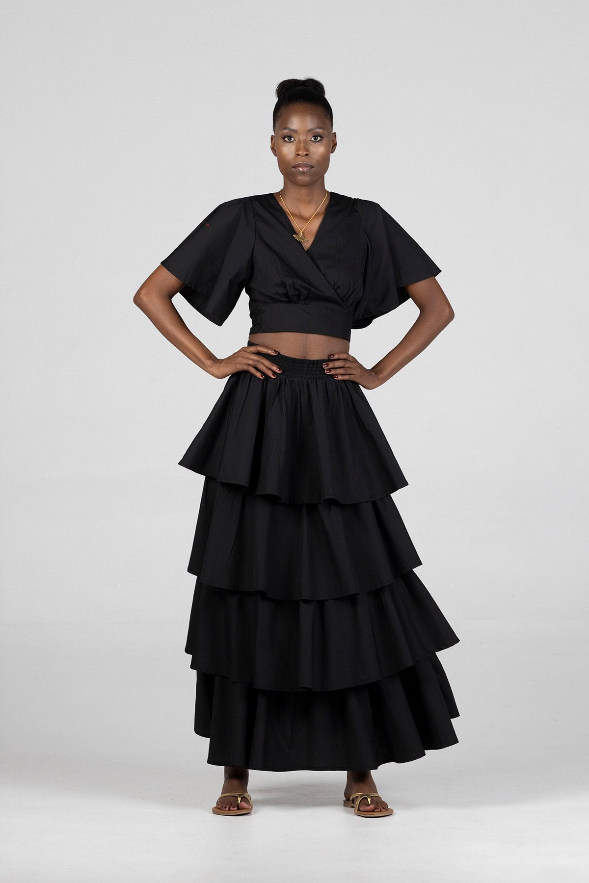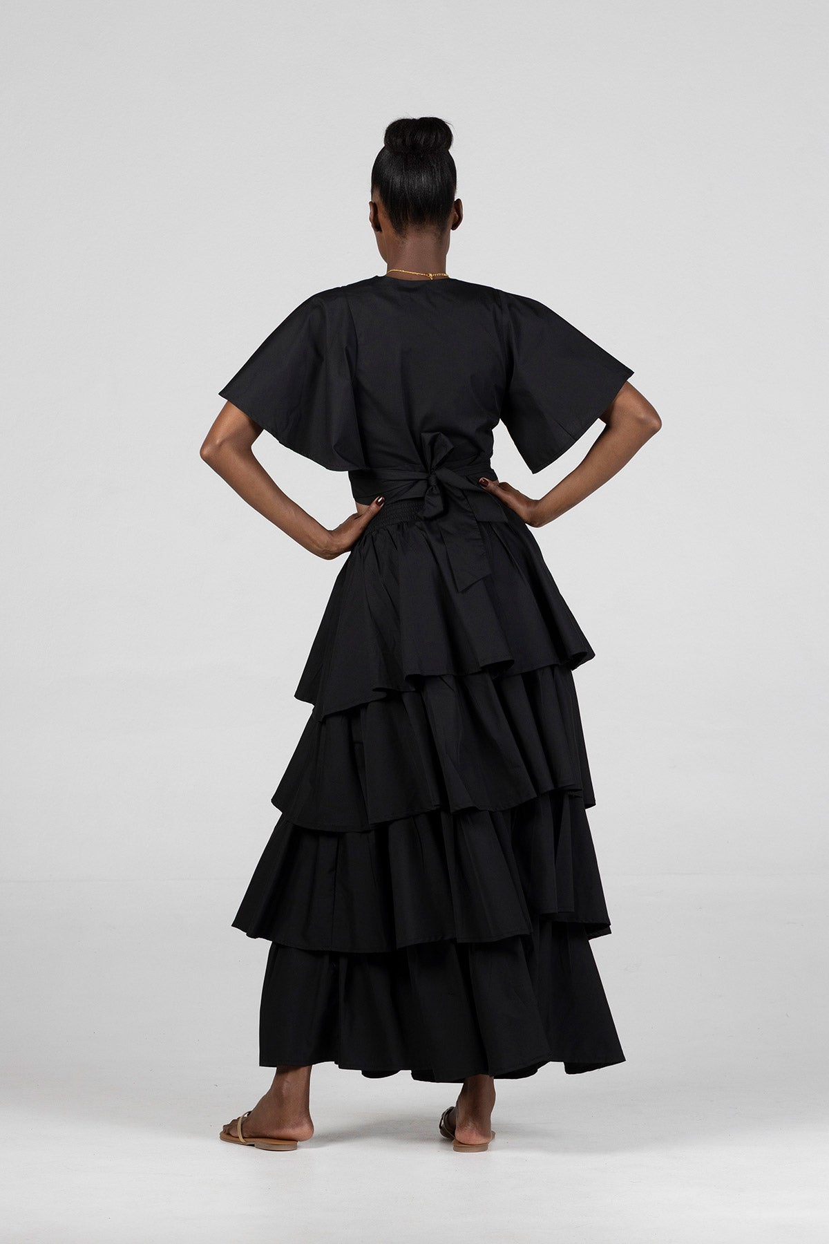 • Flowing layered silhouette for soft volume and dramatic movement