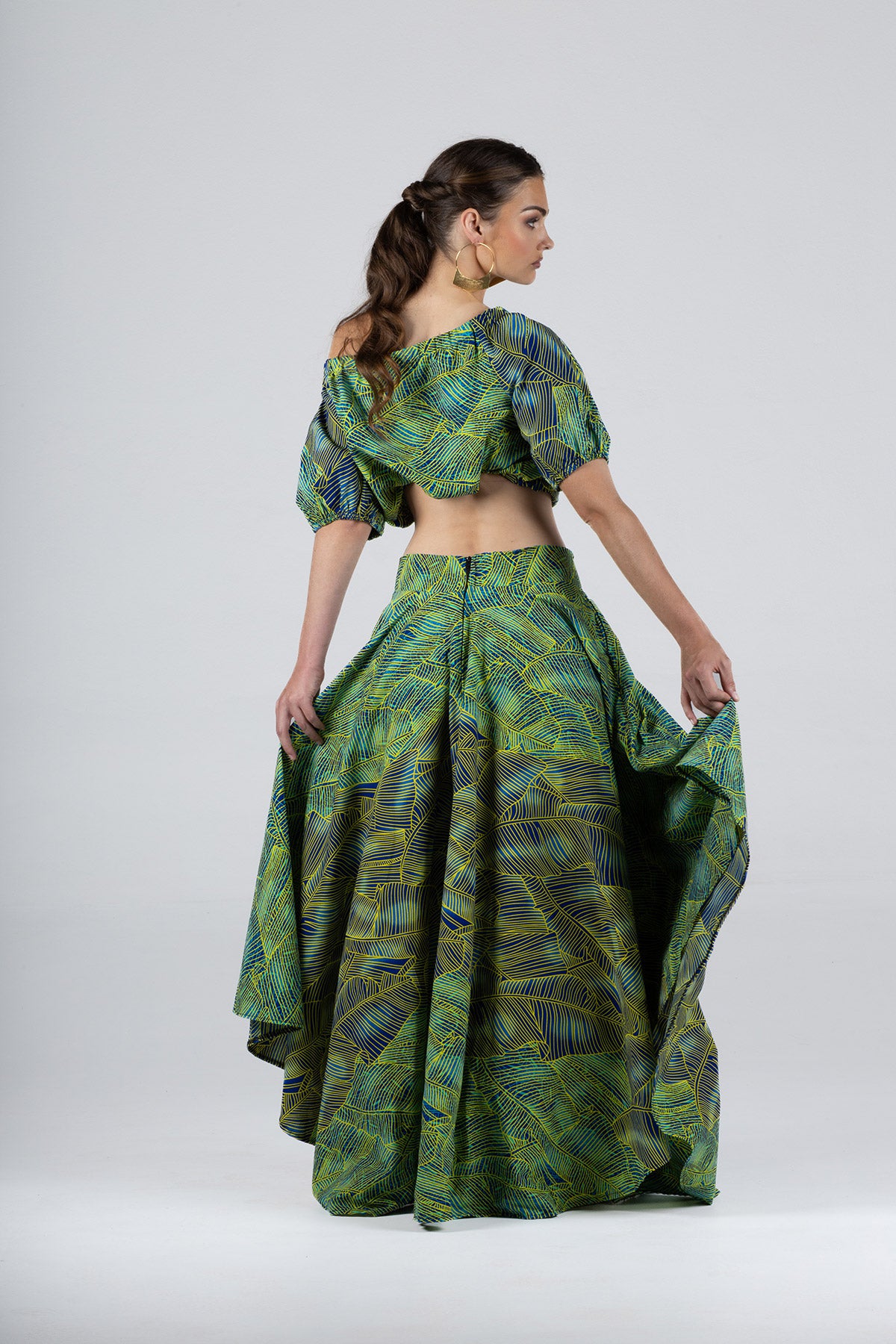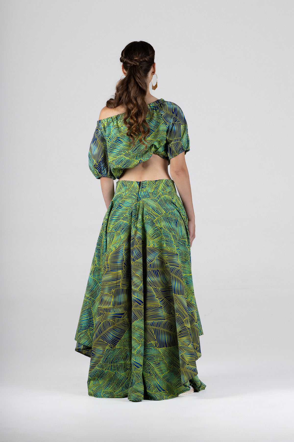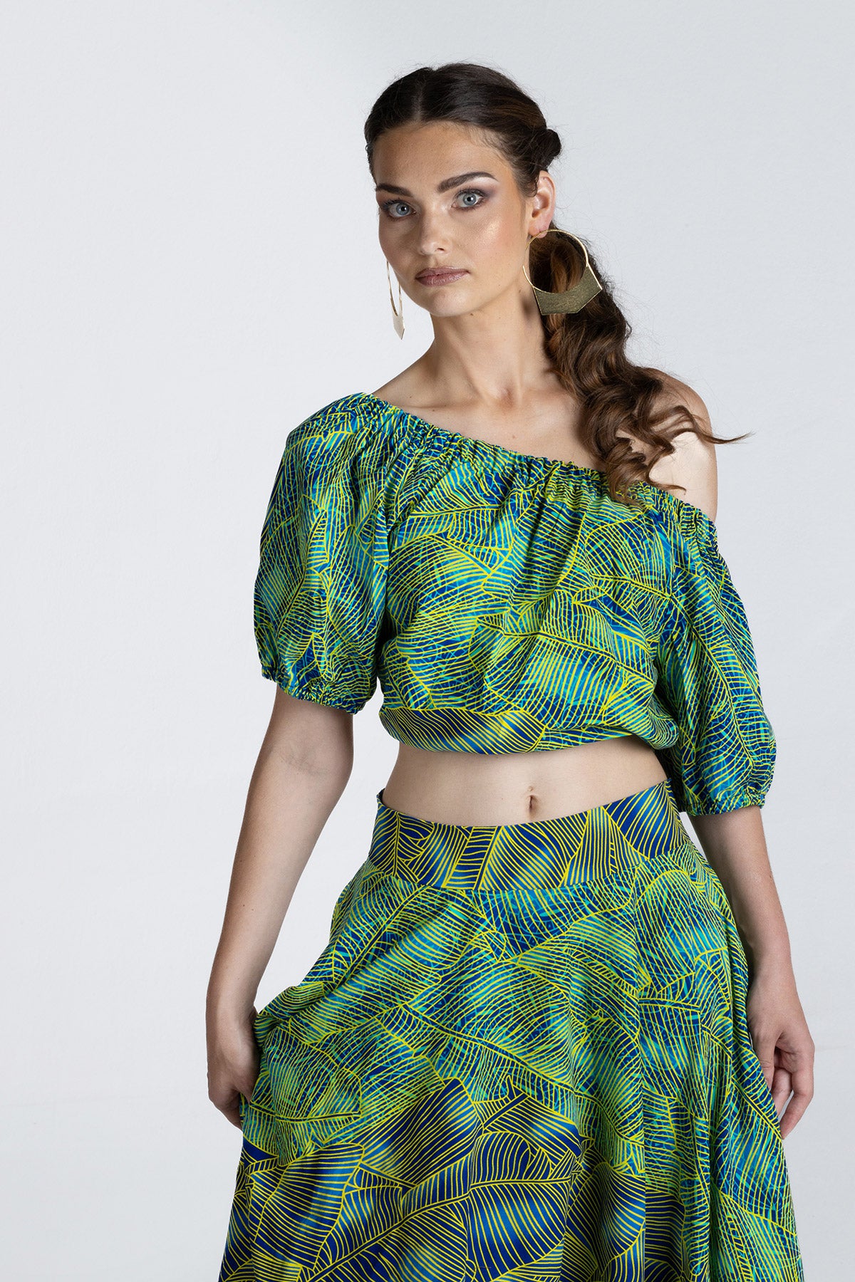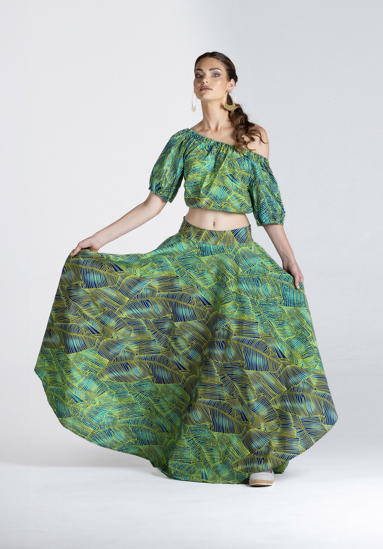 This vibrant two-piece set features a bold green, blue, and yellow leaf print that makes a striking statement. The off-shoulder cropped top has a relaxed fit with soft sleeves, while the high-waisted maxi skirt flows beautifully to the ankles, creating a flattering, feminine silhouette. Perfect for summer events, holidays, brunch dates, or special occasions where you want to stand out with effortless elegance.