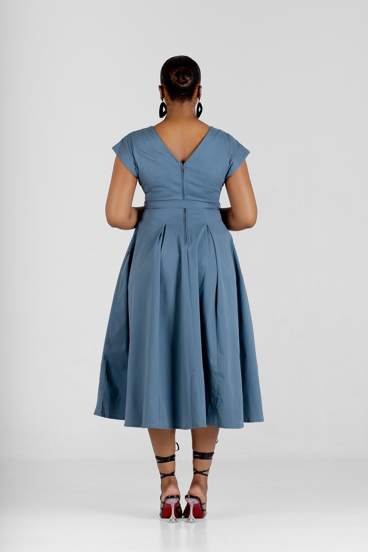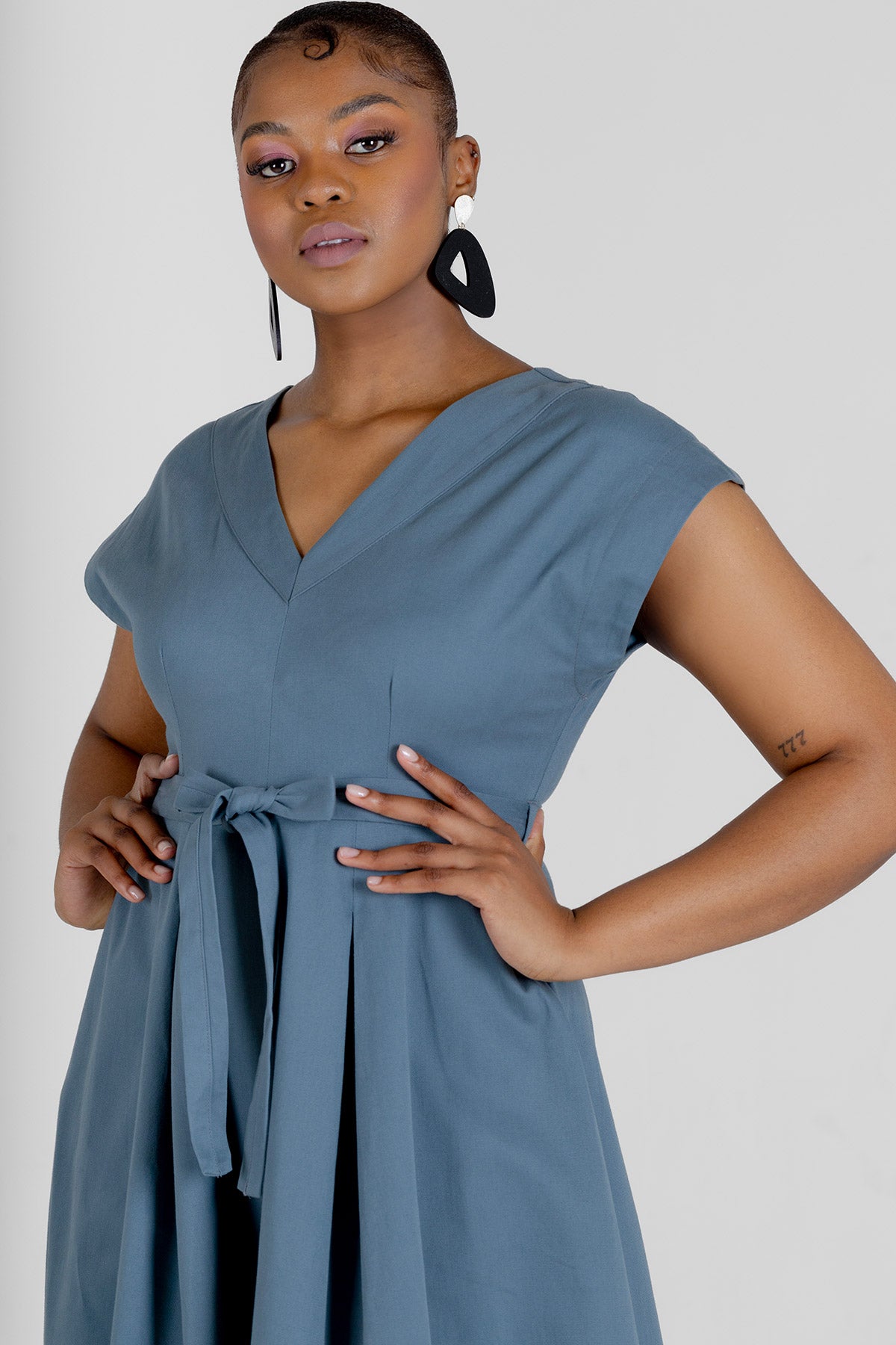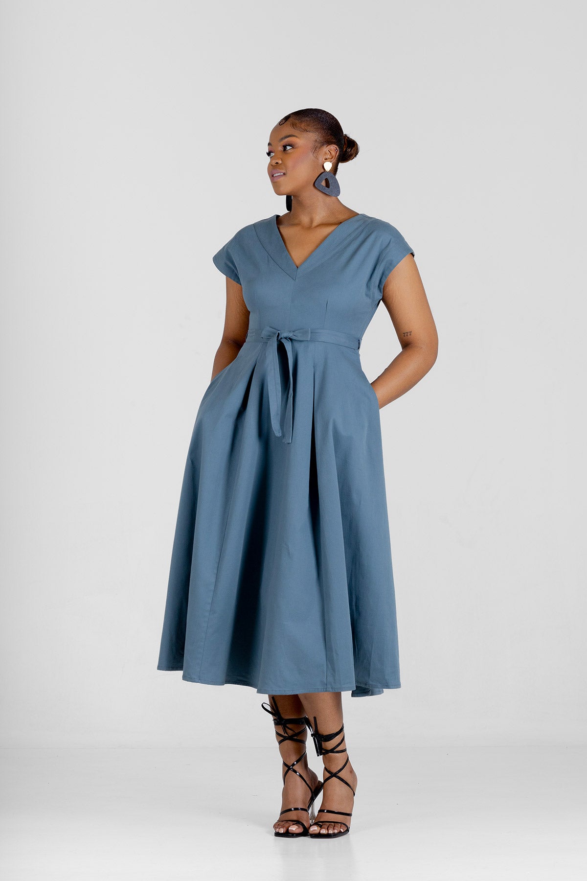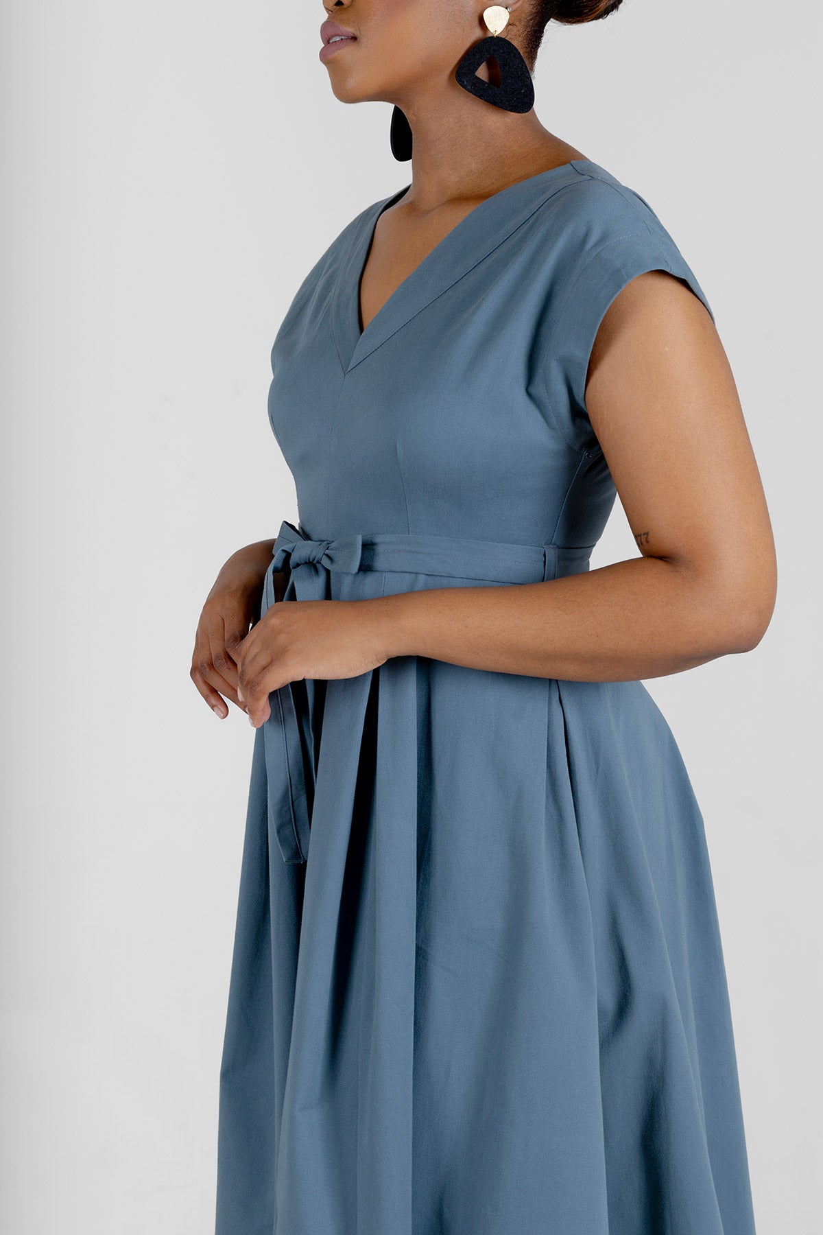 A dress made to hold presence with quiet confidence. The Zweli dress is crafted from smooth storm twill — a midweight cotton with a gentle stretch and a soft, structured hand. Its silhouette is graceful yet grounded: a gently plunging V-neckline, flowing midi-length skirt, and all-in-one sleeves that fall with ease. A self-tie belt invites you to define the waist or let it drape naturally.