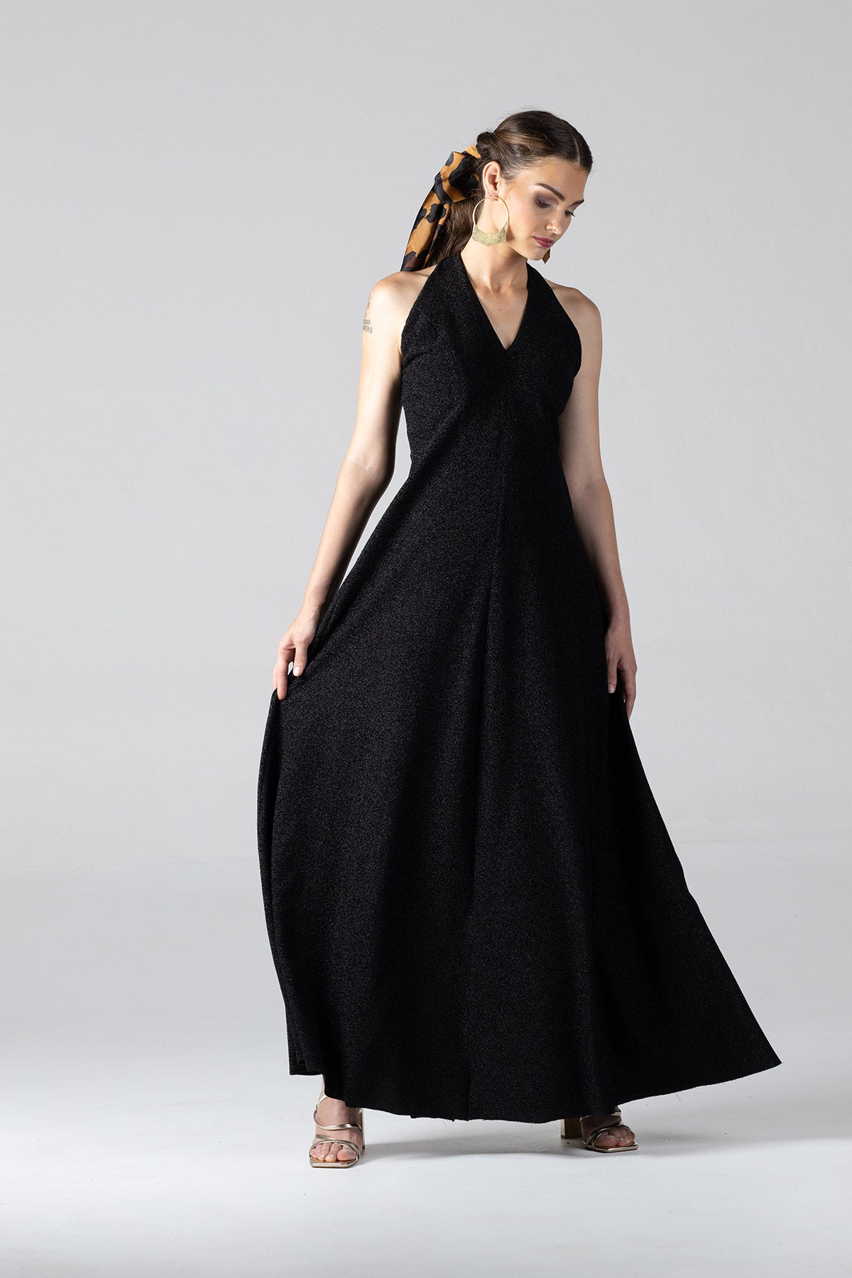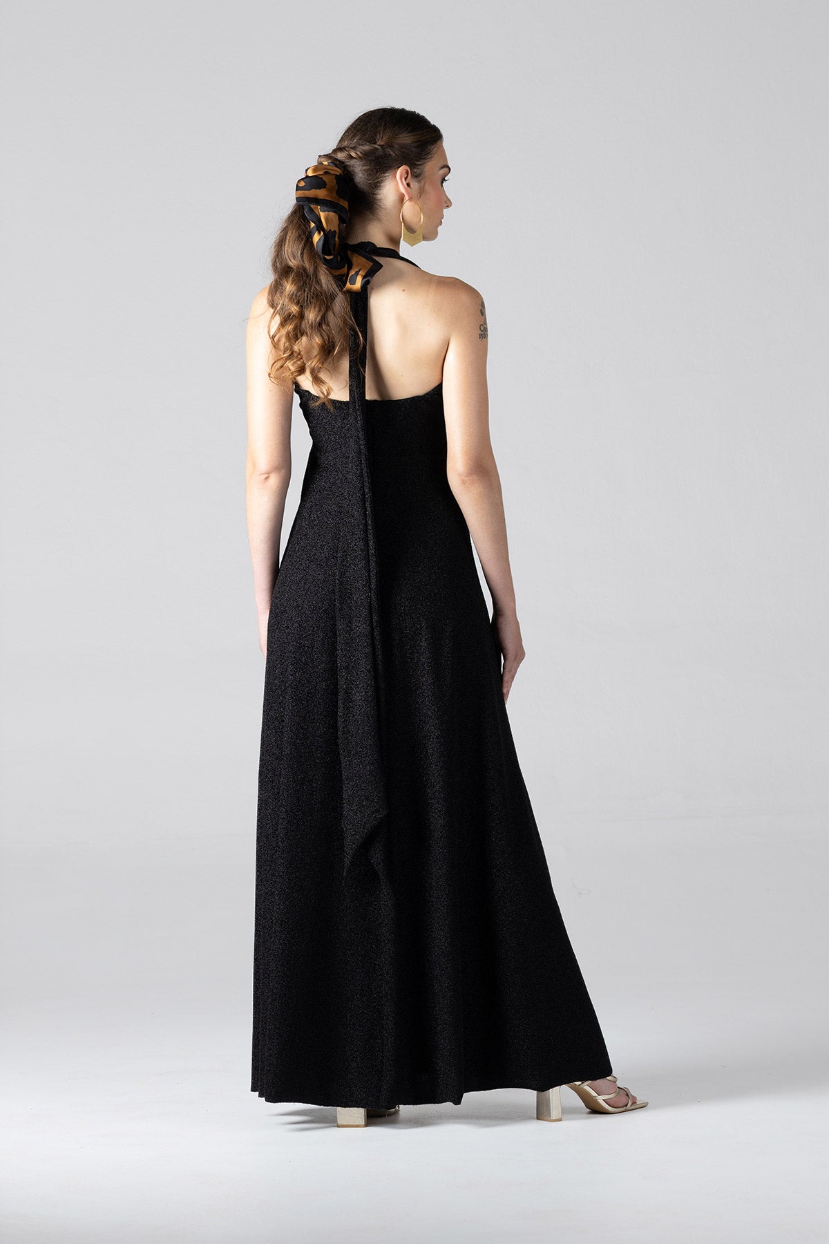 This crossover tie dress in luxe, four-way stretch Lurex offers a radiant blend of elegance and allure. The fitted waist accentuates your shape, while the maxi length drapes beautifully for a sleek, elongated silhouette. With versatile, extra-long ties, this dress allows you to personalize your look: style the ties in a large, dramatic bow at the back, or wrap them around the waist with a crossover effect that flows gracefully down your back.Designed to shimmer with every movement, this dress is ideal for any occasion where you want to exude confidence and sophistication.