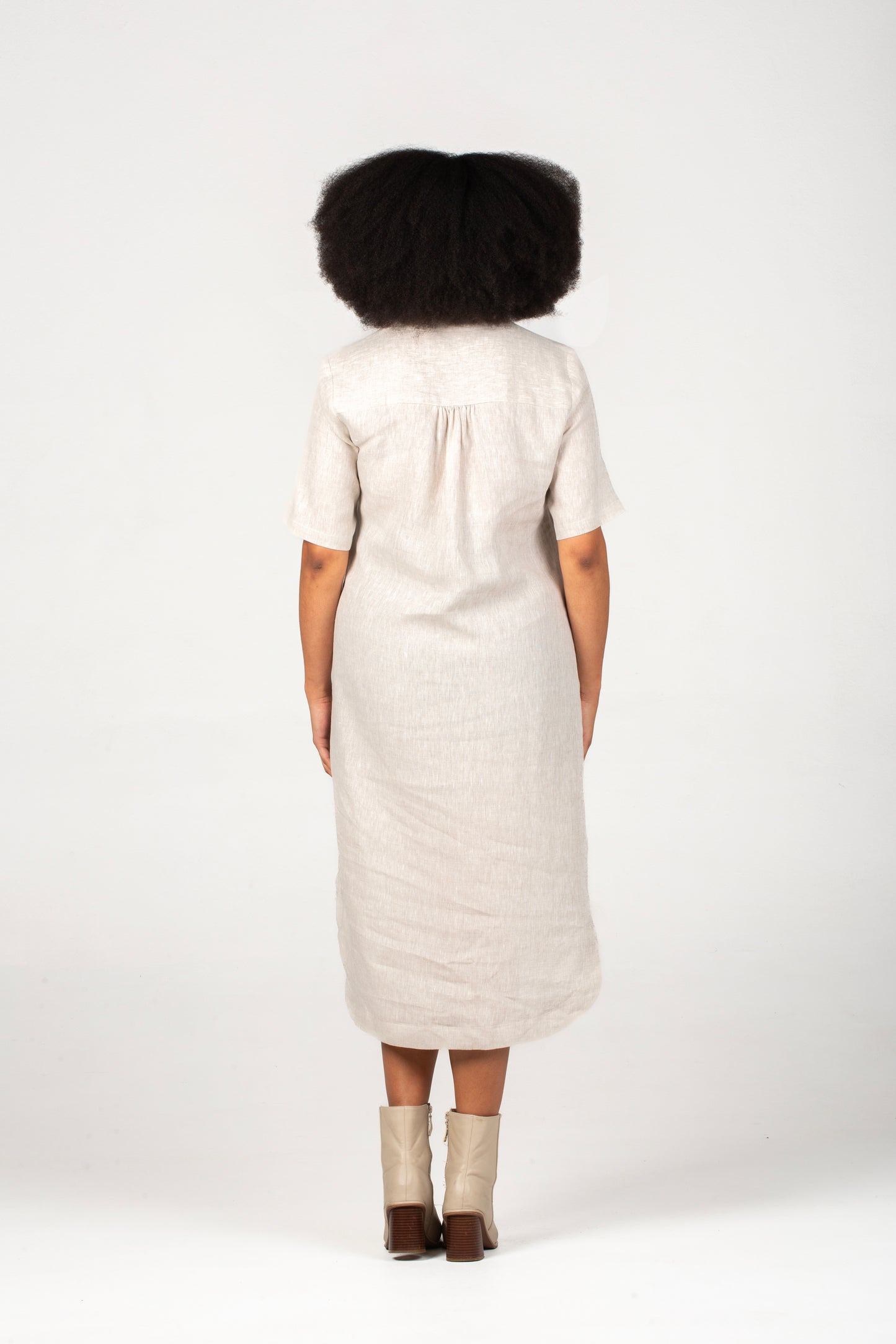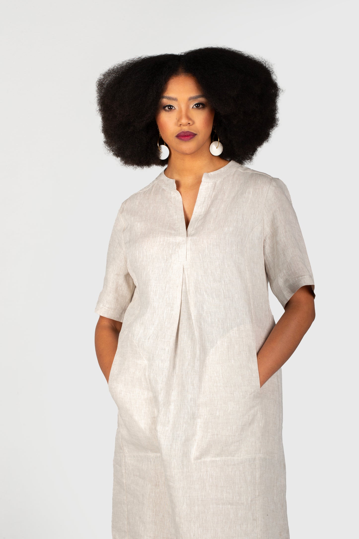 Alli is a relaxed kaftan, effortlessly blending ease and refinement. The mandarin collar and placket meet at a soft centre-front pleat, while short sleeves and a back yoke with delicate gathers create gentle movement. Kurta-inspired pockets add subtle practicality, and the shaped-faced hem lends a considered finish. Crafted in 100% linen, the natural hue offers a timeless, versatile tone that wears beautifully across seasons. Available in sizes 32–46, Alli embraces a diverse fit, ensuring the same ease and elegance for every silhouette.