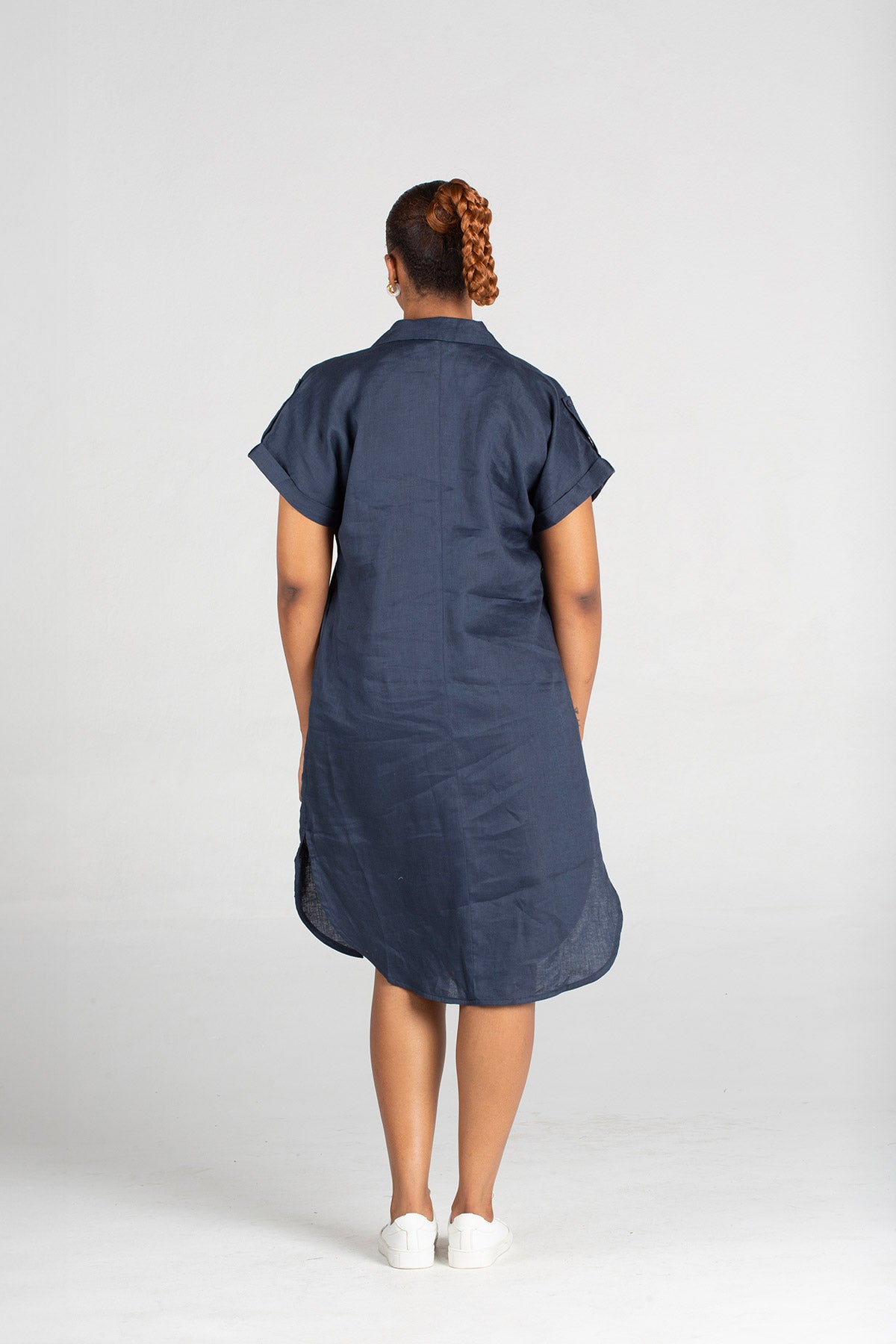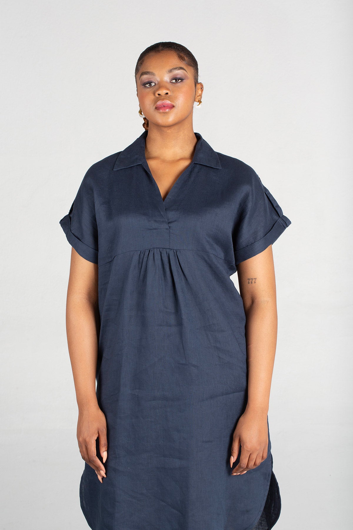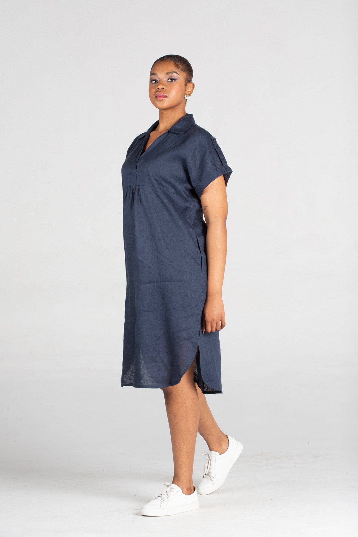 Cannes is a below-the-knee dress that blends relaxed ease with quiet refinement. The collared V-neckline is softened by gentle gathers from the bust cutline, adding a touch of movement and fluidity to the silhouette. Grown-on sleeves finish with turn-back cuffs and tab detail, offering a subtle nod to tailoring. Side entry pockets ensure modern practicality, while the navy slub weave linen brings lightness and breathability, making this piece a versatile choice for warm-weather dressing. With a size range from 32–46, Cannes is thoughtfully designed to complement a variety of body shapes with effortless sophistication.