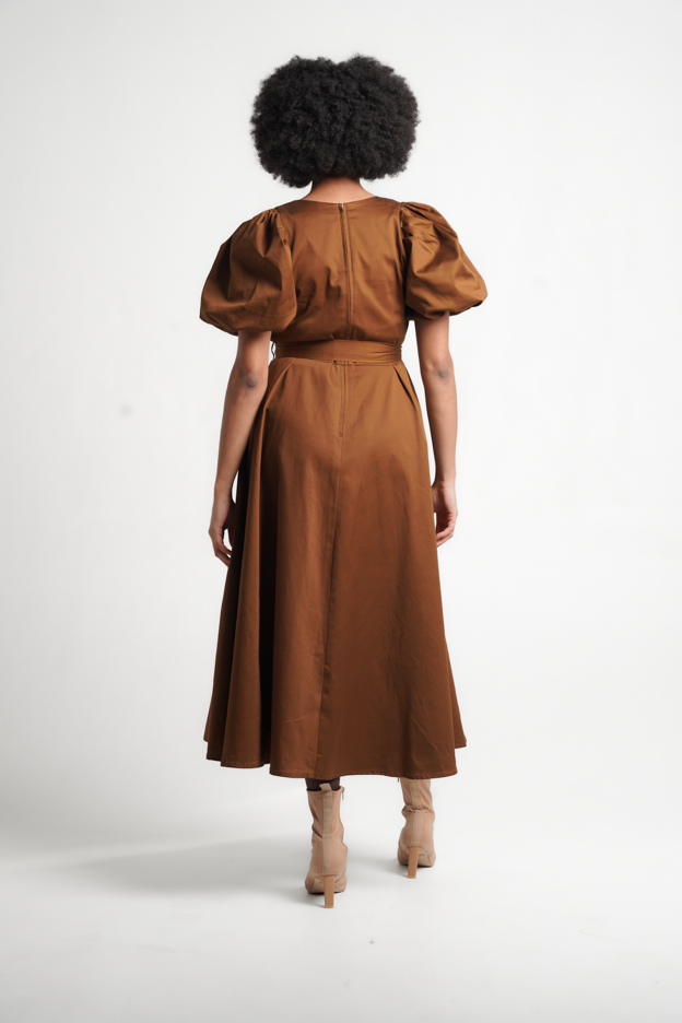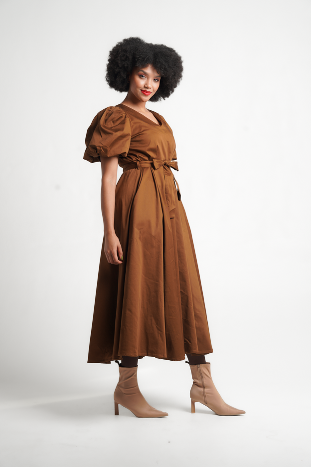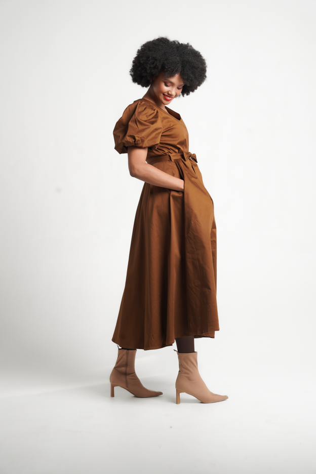The Hill is a midi-length dress with a V-neck, voluminous raglan puff sleeves, pleated skirt, self-tie belt, side entry pockets, and a center-back zip opening. It is crafted from a Cotton/Spandex blend and comes in a gorgeous Bronze colorway.