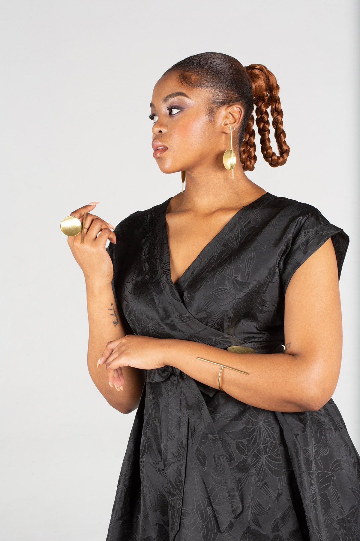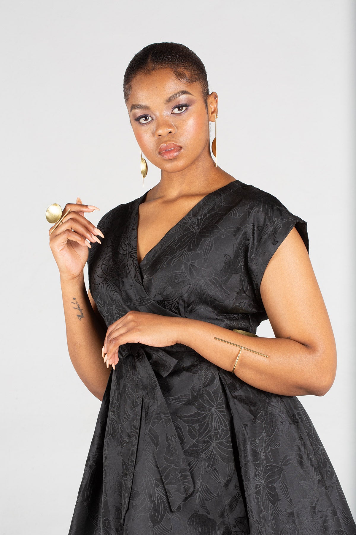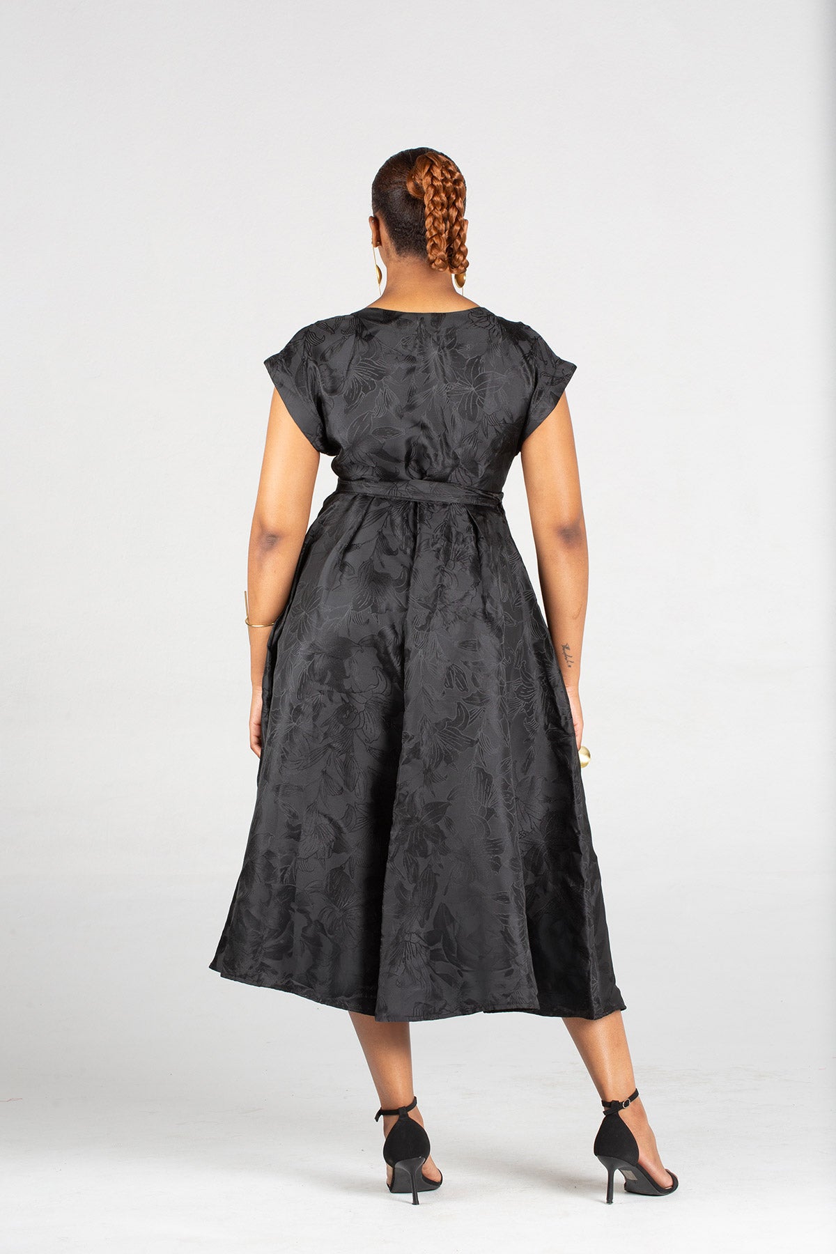 The Lajuma dress is a beautifully structured wrap dress that blends classic tailoring with modern ease. Cut in a flattering midi length, it features a clean V-neckline, grown-on sleeves, and thoughtful pleat detailing at the front and back for added shape and movement. Side-entry pockets add a practical touch, while the wrap silhouette allows for an adjustable fit that works for a range of occasions—whether styled semi-formal or dressed up.