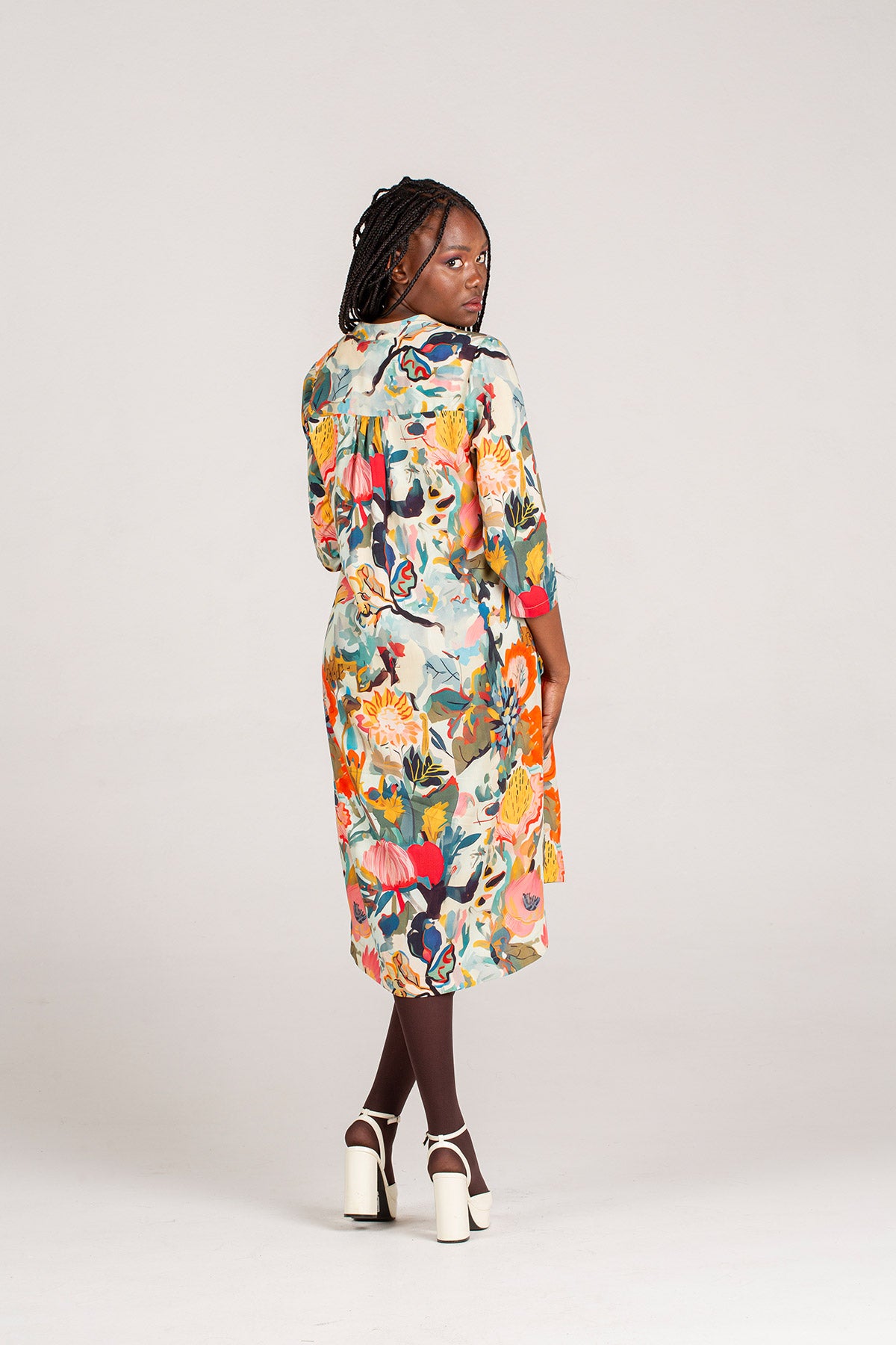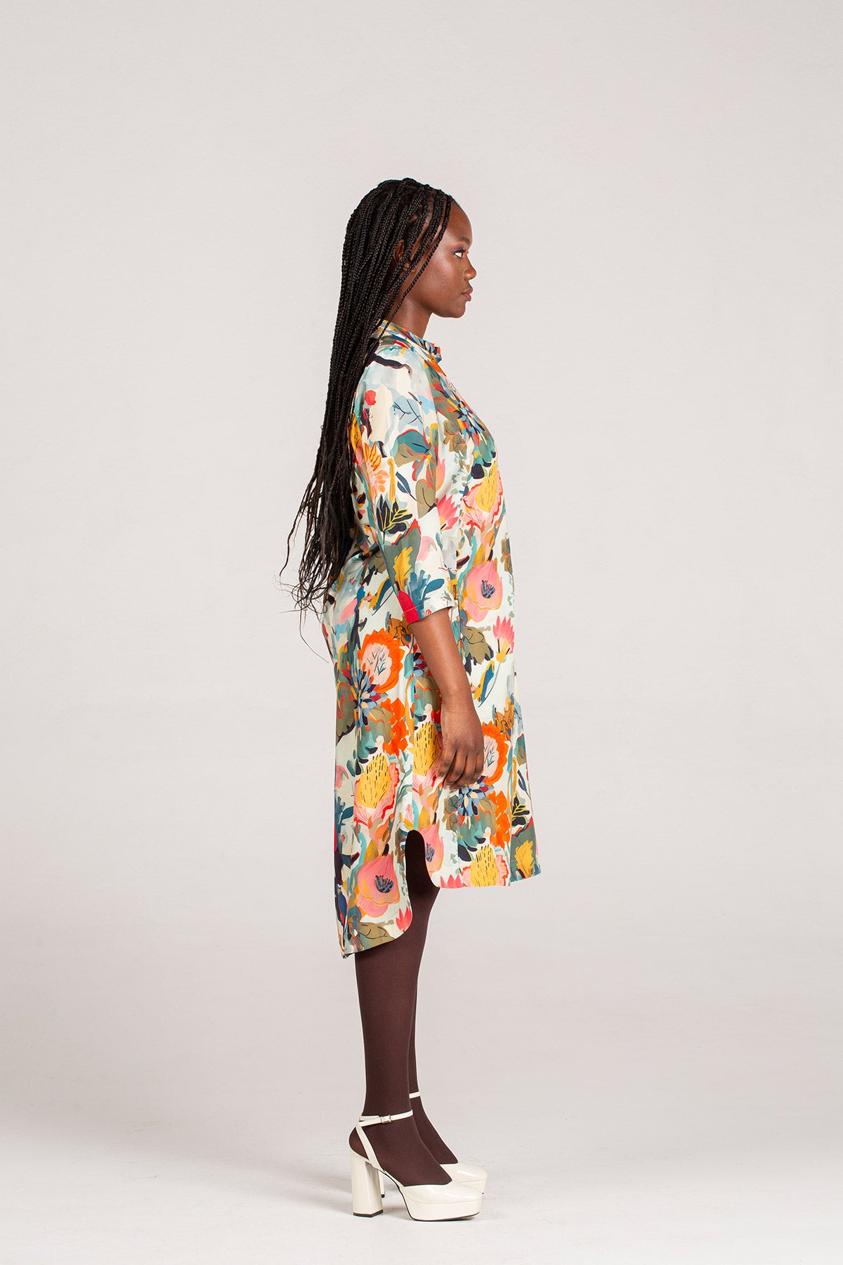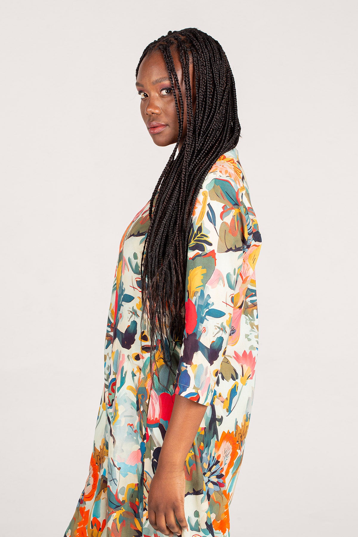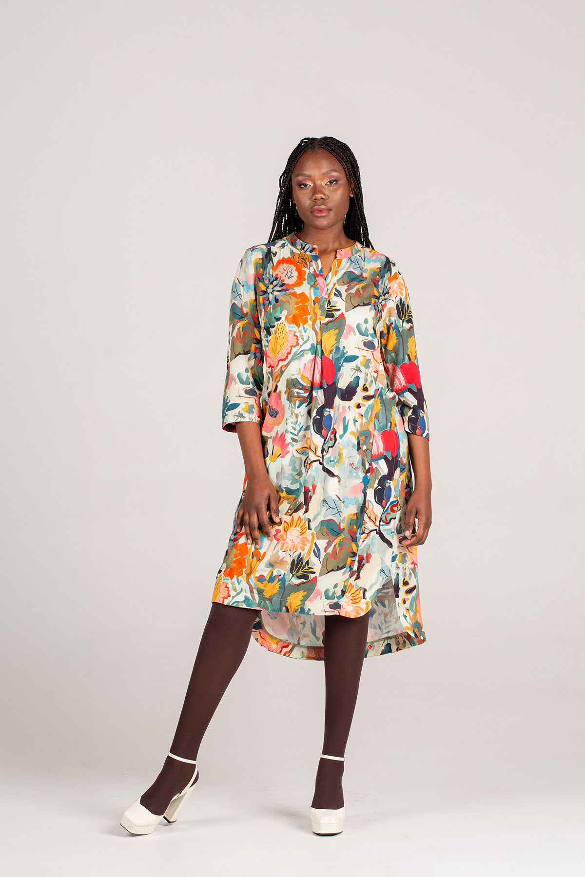 The hem is gently shaped and faced, offering a soft curve that flatters the line of the body, while kurta-inspired side-entry pockets lend a subtle nod to tradition with a functional twist. Cut in a fluid 100% rayon with a vivid multi-floral print, Lilli carries colour with elegance — vibrant, yet grounded in its simplicity.