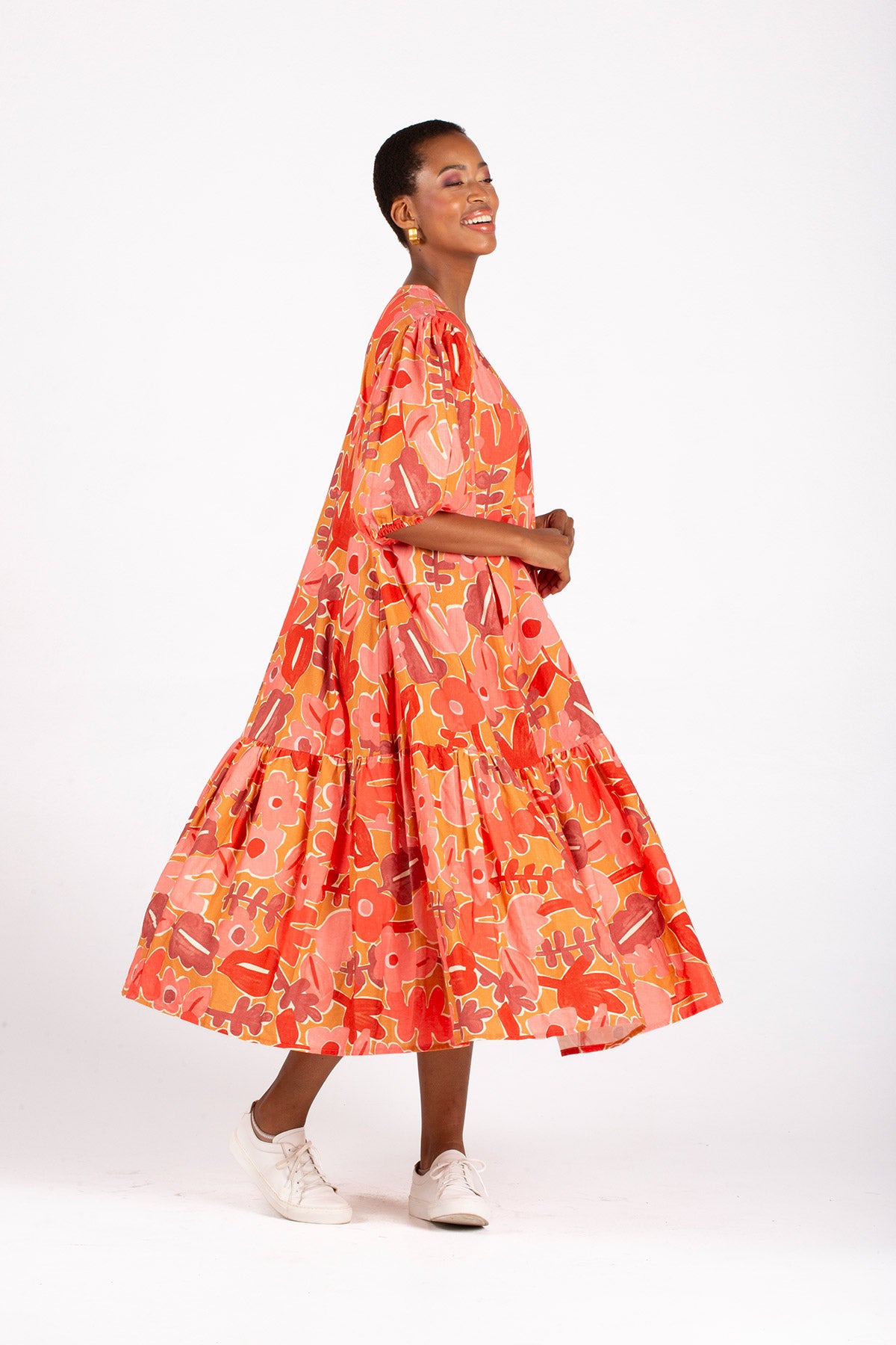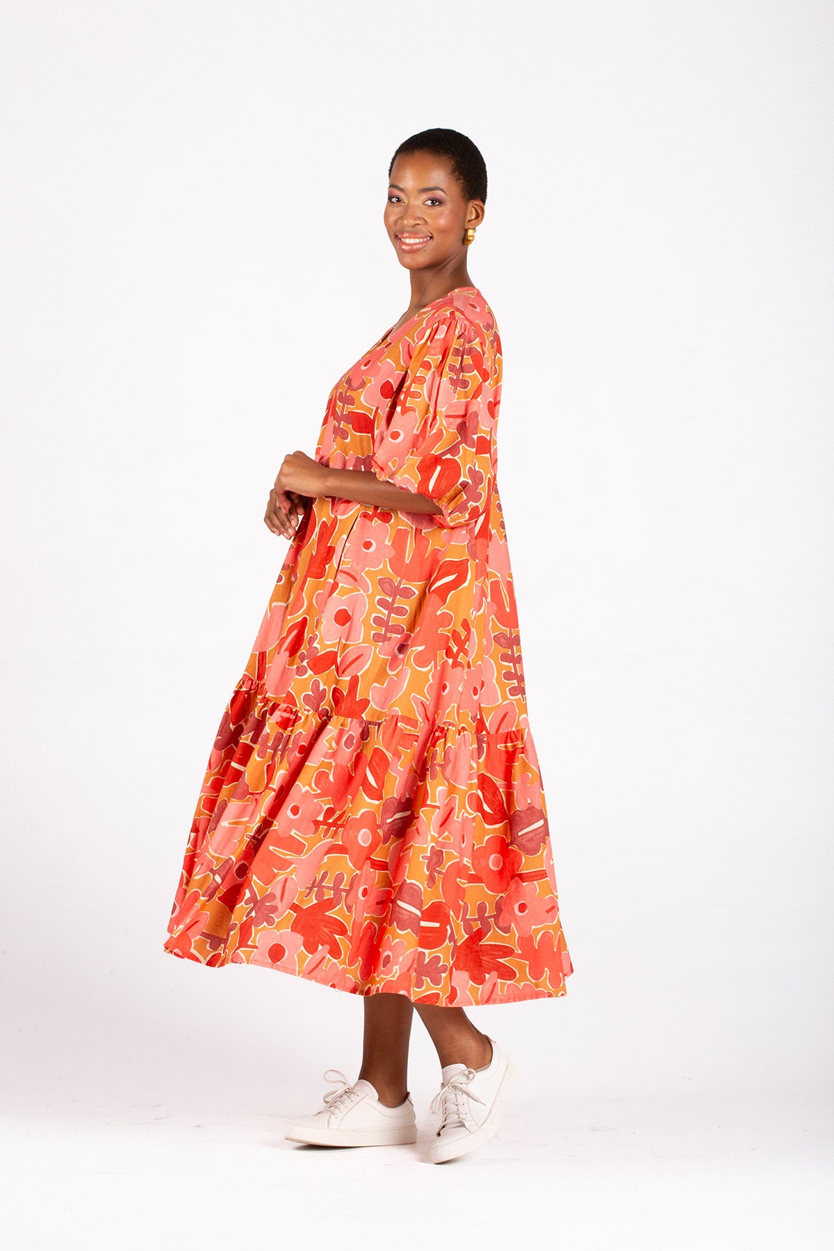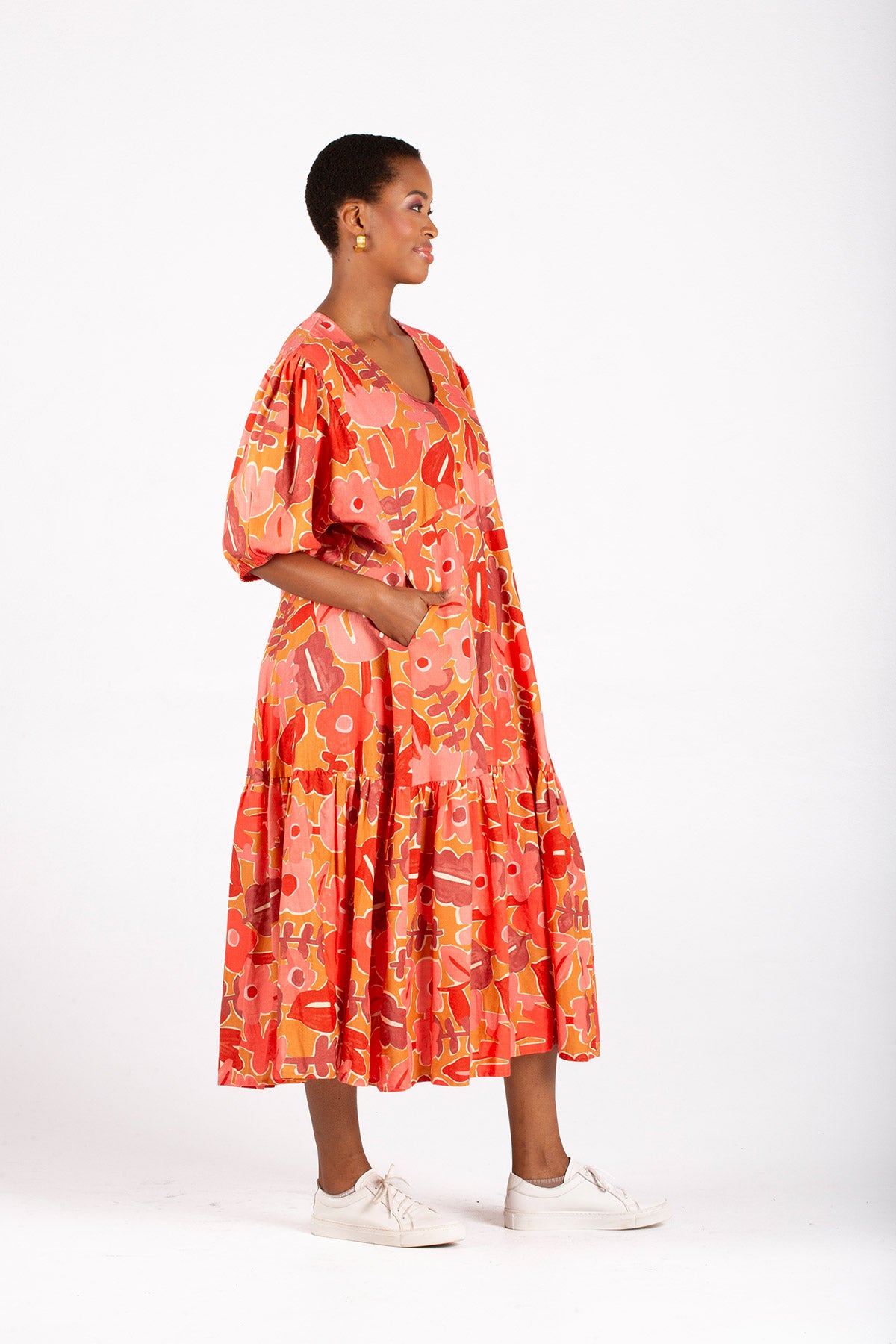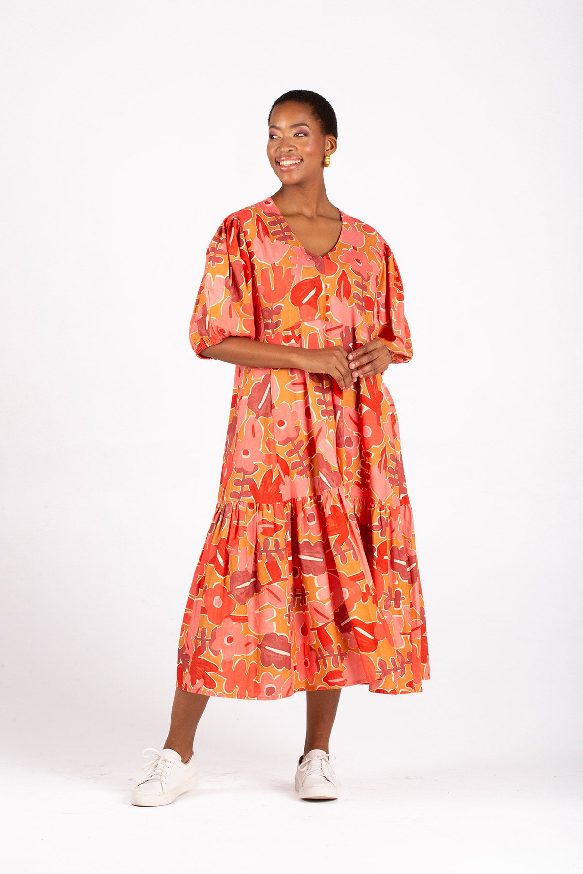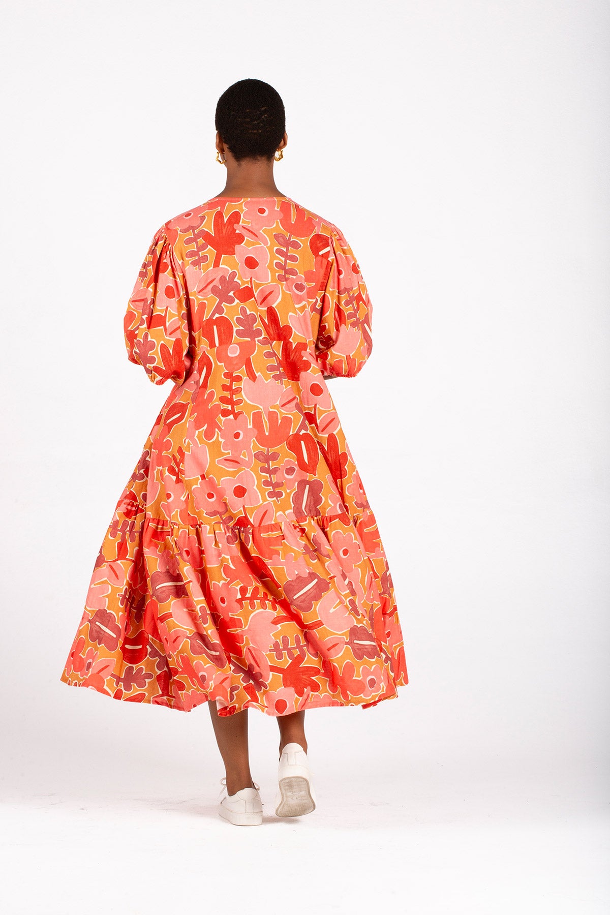 The Meadow Is A Knee-Length Dress With A Flattering V-Neckline, A Single Gathered Tier, Voluminous 3/4 Sleeves With An Elasticated Cuff, And A Gathered Sleeve Head For Added Elegance.