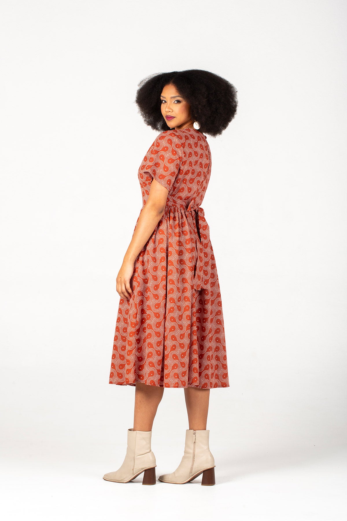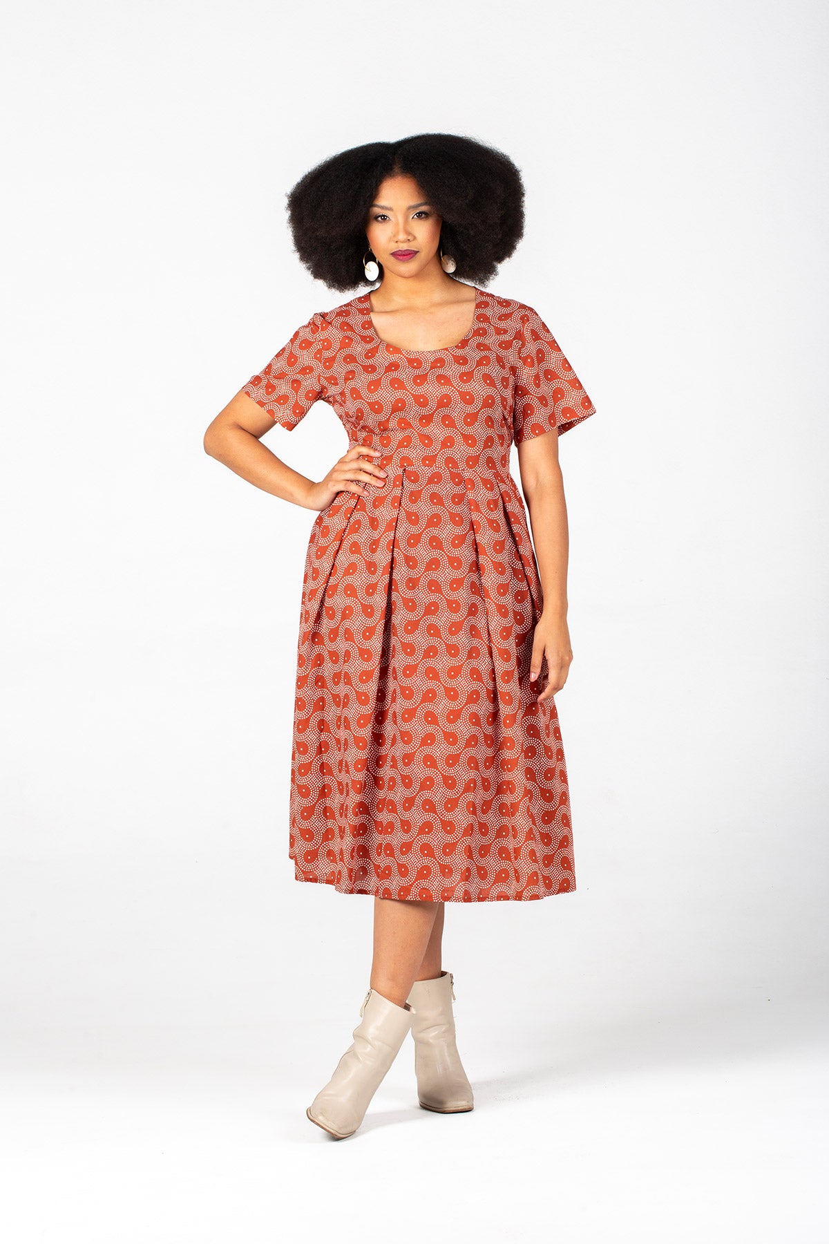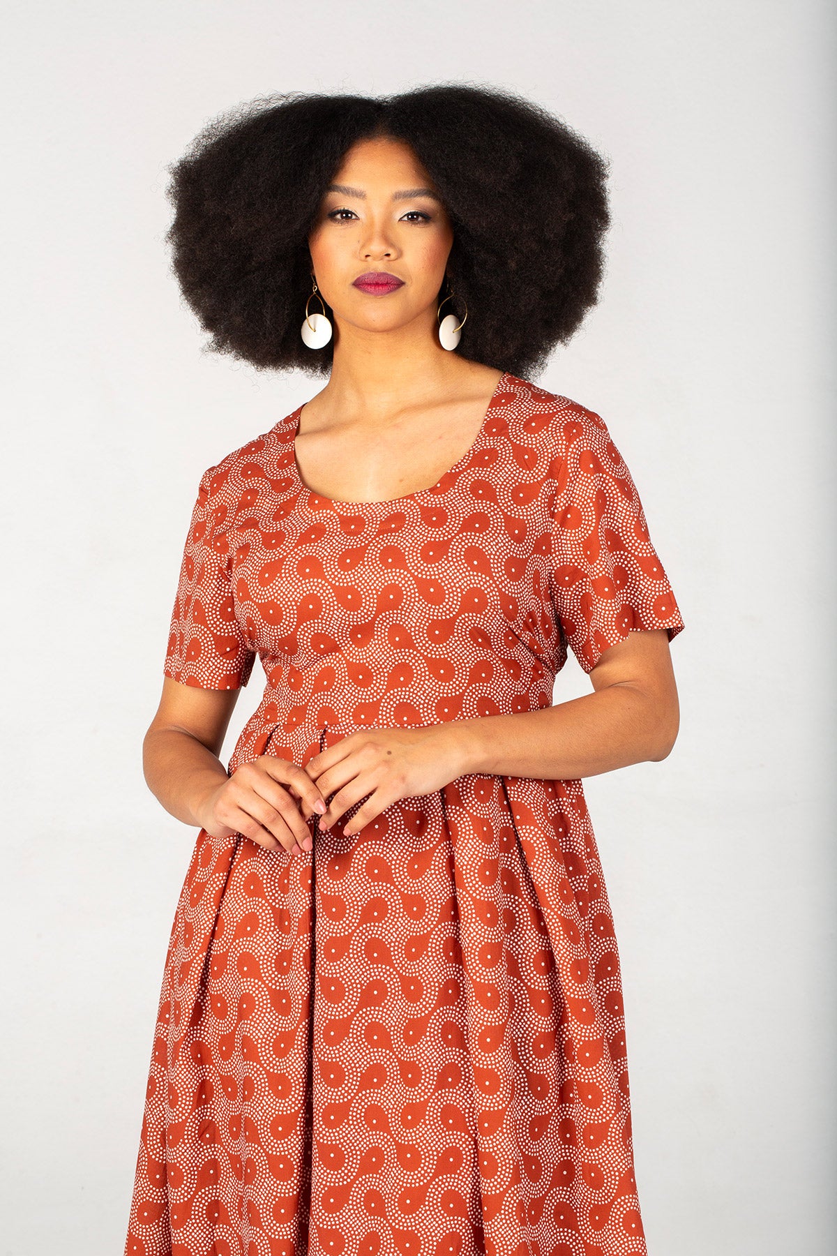 Rand is a scooped-neck midi dress that offers a balance of ease and structure. Short sleeves and an empire line create a gentle shape, while the skirt falls with a considered mix of gathers and pleats for subtle volume and movement. An attached self-tie belt allows for versatile styling, defining the waist or leaving the fit relaxed. Complete with a centre back zip and side entry pockets, Rand is crafted in 100% cotton with a red and white abstract monotone print, giving the piece natural breathability and everyday comfort. Available in sizes 32–46, this dress is designed to complement a wide range of silhouettes with effortless wearability.