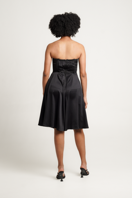 Silverton is the embodiment of timeless elegance and modern allure. This over-the-knee strapless boned corset bustier is designed to make a statement. The A-line skirt adds a touch of sophistication, while the center back zip ensures a seamless fit.