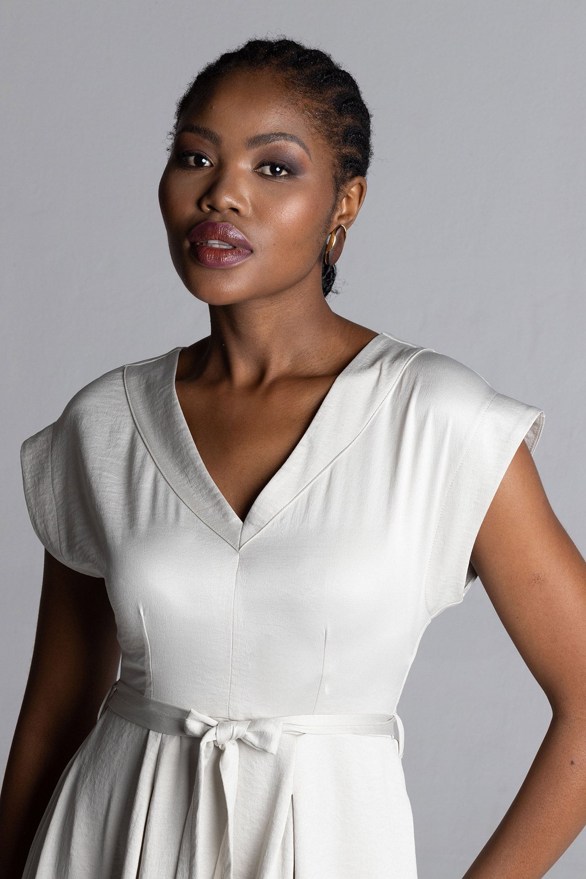 - Self-tie belt allows adjustable waist definition