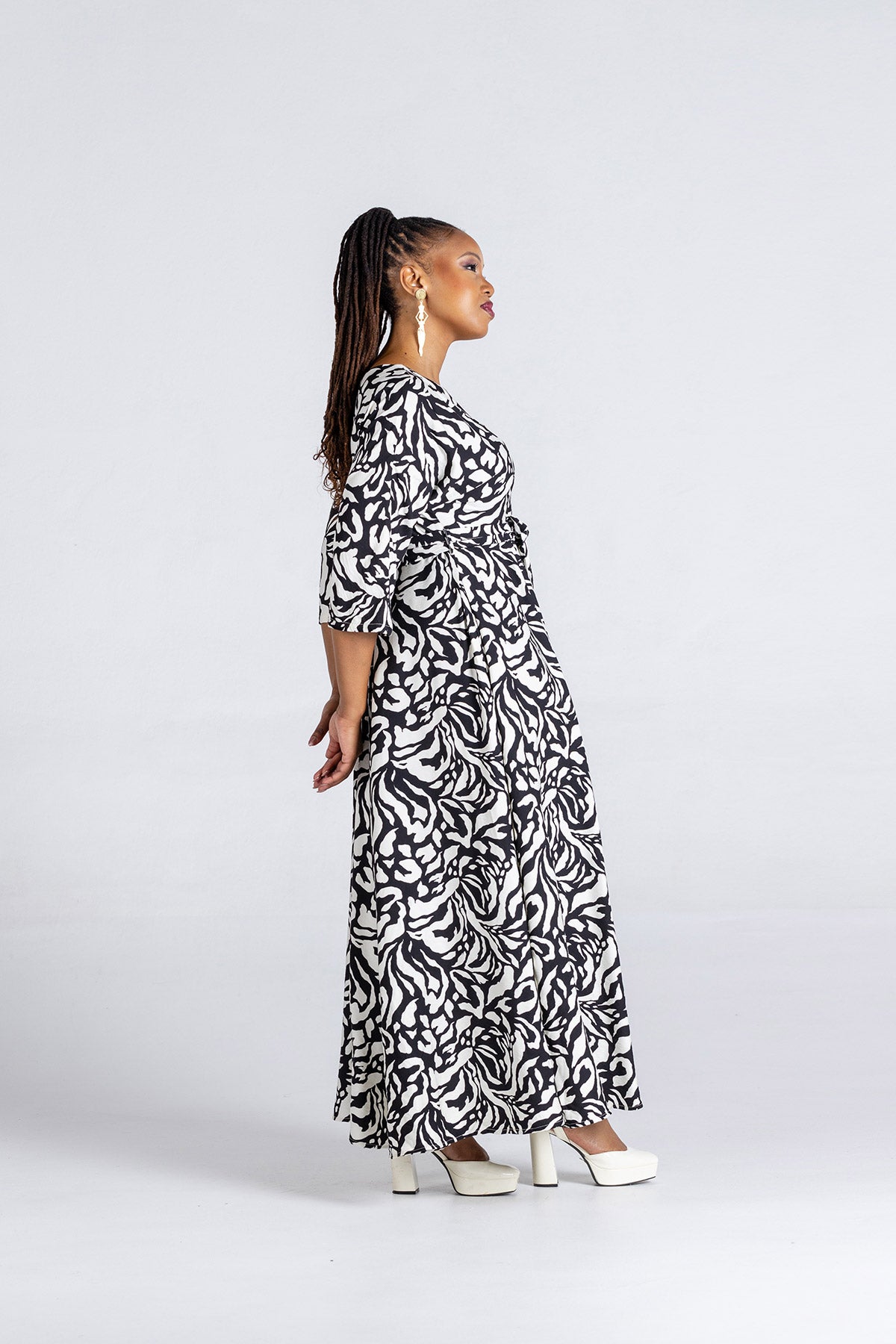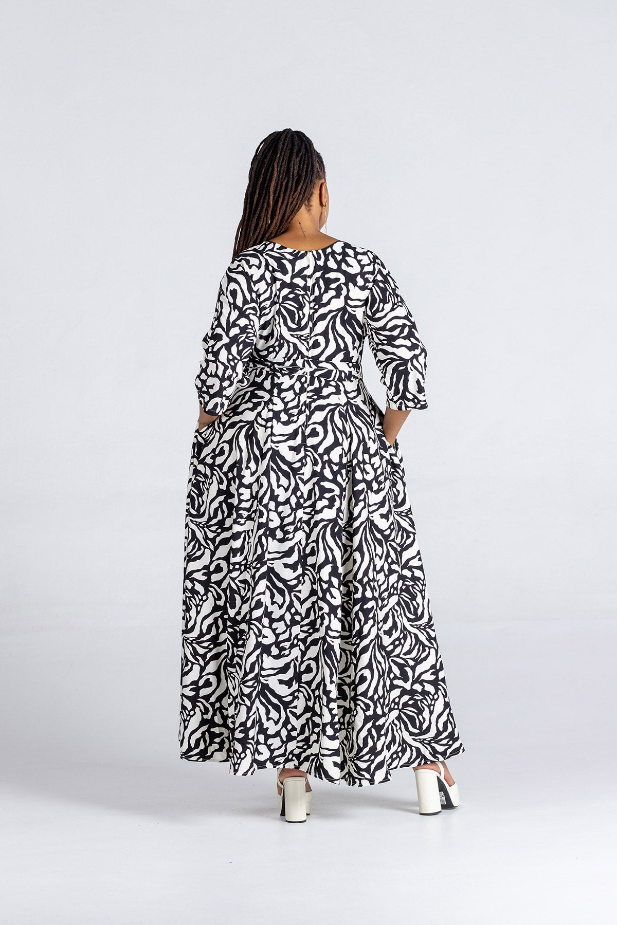 Tugela is a V-neck maxi dress that combines ease with fluid movement. The full skirt falls gracefully from the waist, balanced by 3/4 length all-in-one sleeves that frame the silhouette with understated drama. A centre-back zip allows for a seamless fit, while inseam pockets add quiet functionality. The self-tie belt defines the waist, offering the option of soft structure or relaxed drape. Crafted in 100% rayon, the black base is lifted by a mustard floral print that feels bold yet timeless. Available in sizes 32–46, Tugela embraces a diverse fit, ensuring the same ease and elegance for every silhouette.