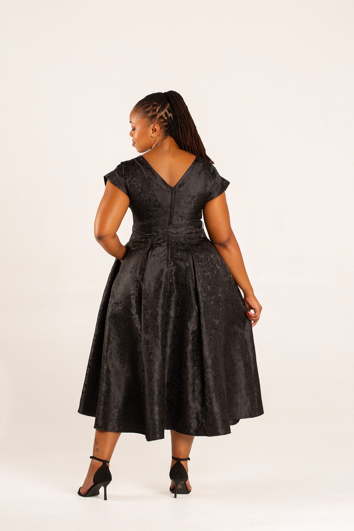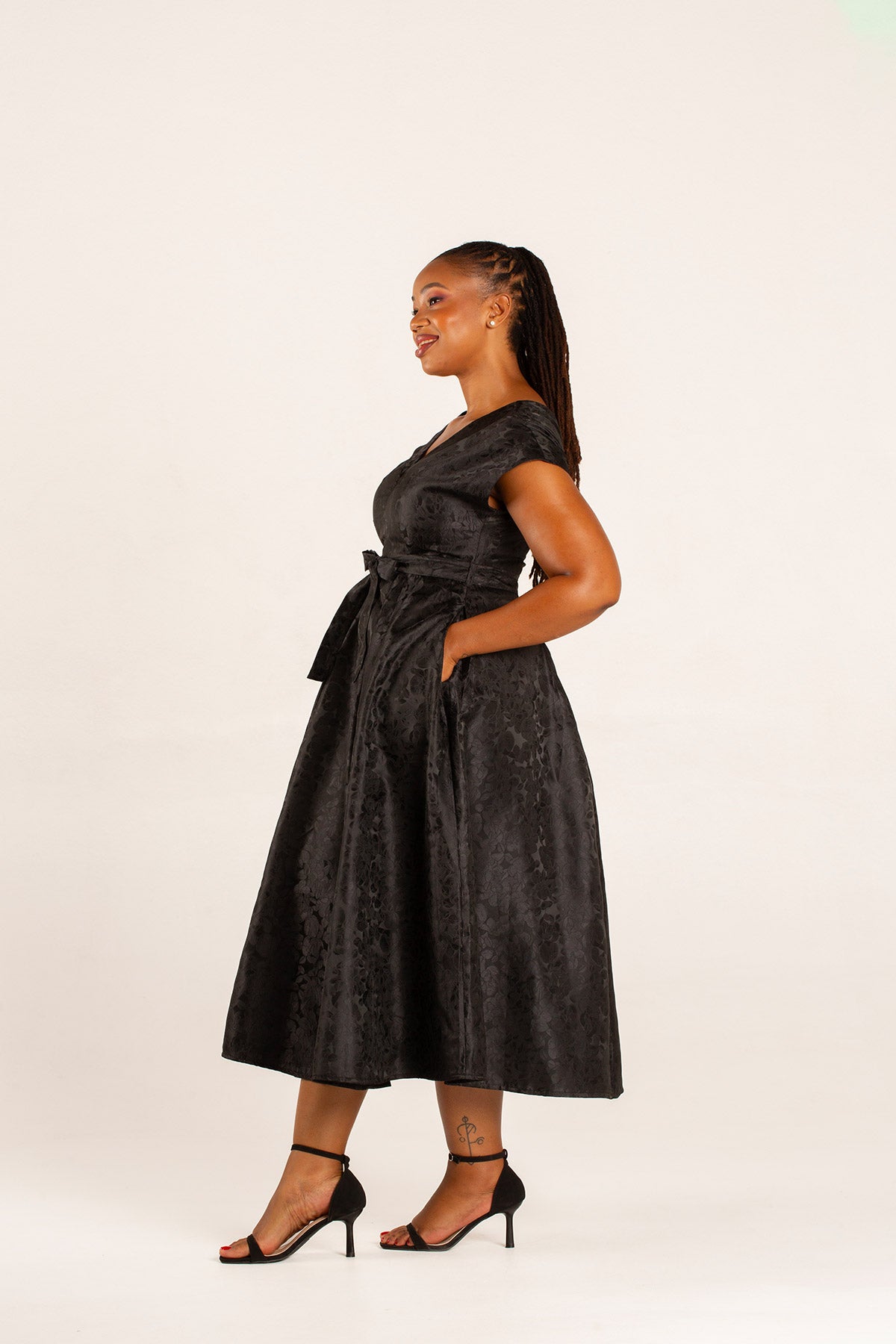 A chic, fun and feminine dress with a brocade fabric in navy/lavender. The full skirt gives this elegant dress a fun flare. Features include an all-in-one sleeve, inseam pockets, centre-back zip entry and a polished finish.