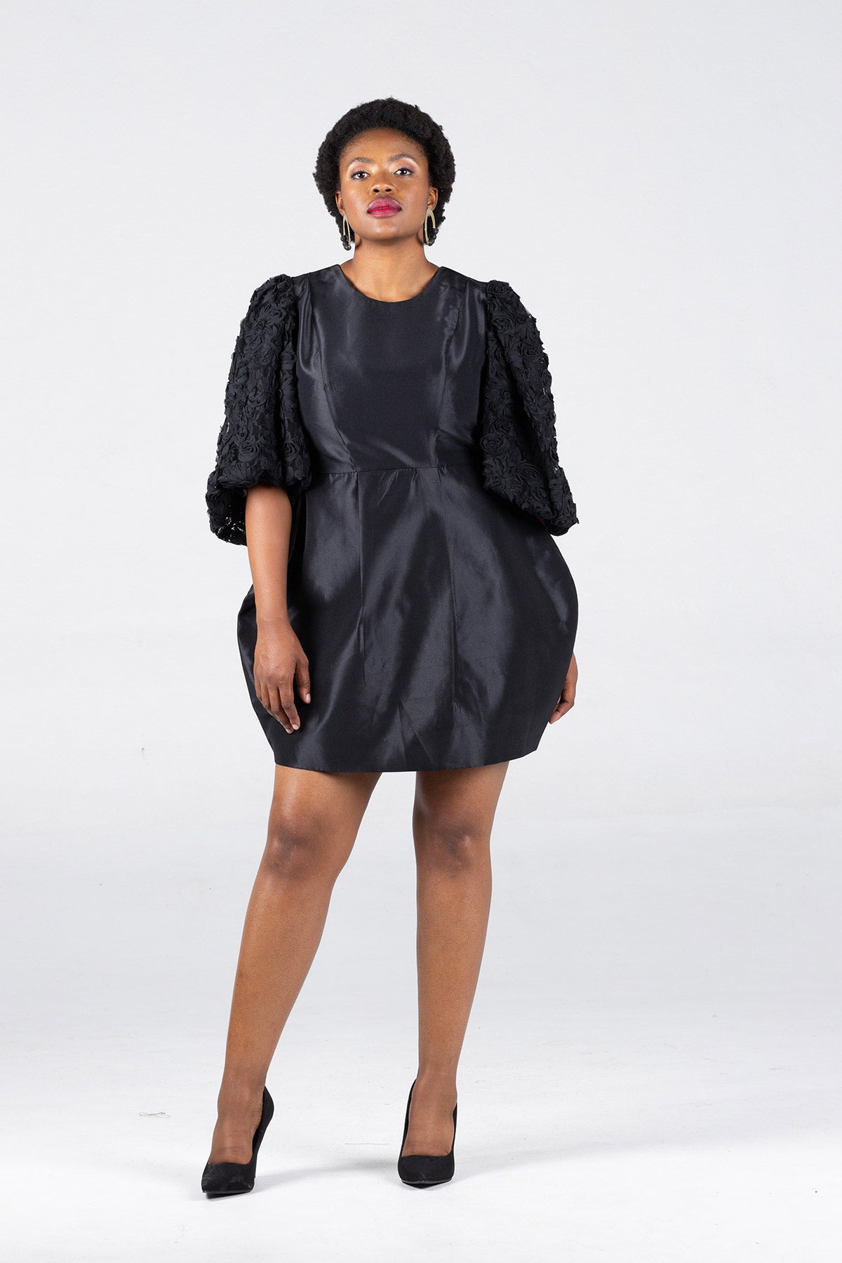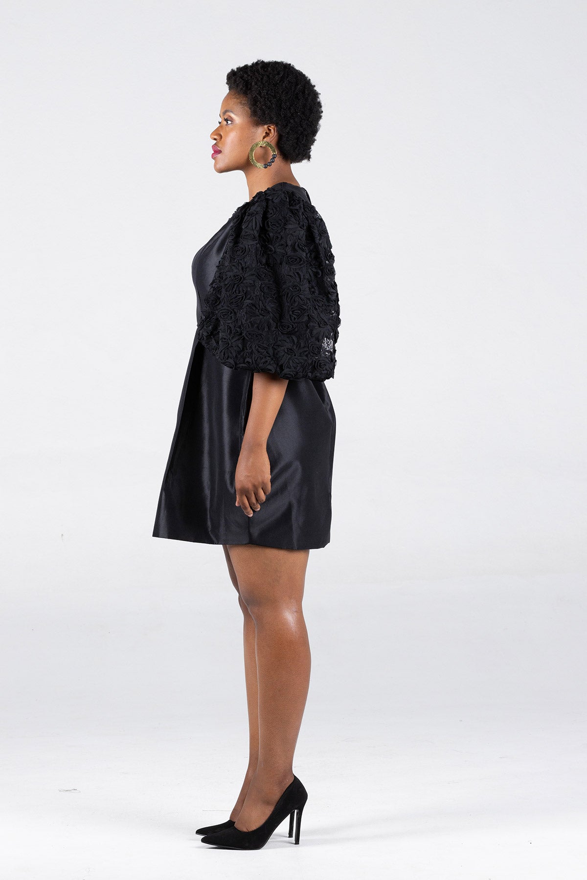 A modern classic with a touch of romance. This black mini dress features voluminous lace-trimmed puff sleeves that add effortless drama, to a sleek, flattering silhouette.